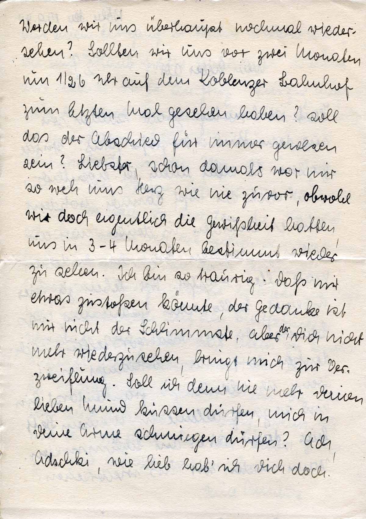 Sollten wir uns vor zwei Monaten um ½ 6 Uhr auf dem Koblenzer Bahnhof zum letzten Mal gesehen haben? Soll das der Abschied für immer gewesen sein? Liebster, schon damals war mir so weh ums Herz wie nie zuvor, obwohl wir doch eigentlich die Gewißheit hatten, uns in 3 - 4 Monaten bestimmt wieder zu sehen. Ich bin so traurig. Daß mir etwas zustoßen könnte, der Gedanke ist mir nicht der Schlimmste, aber der, Dich nicht mehr wiederzusehen, bringt mich zur Verzweiflung. Soll ich denn nie mehr Deinen lieben Mund küssen dürfen, mich in Deine Arme schmiegen dürfen? Ach, Adschki, wie lieb hab’ ich Dich doch.