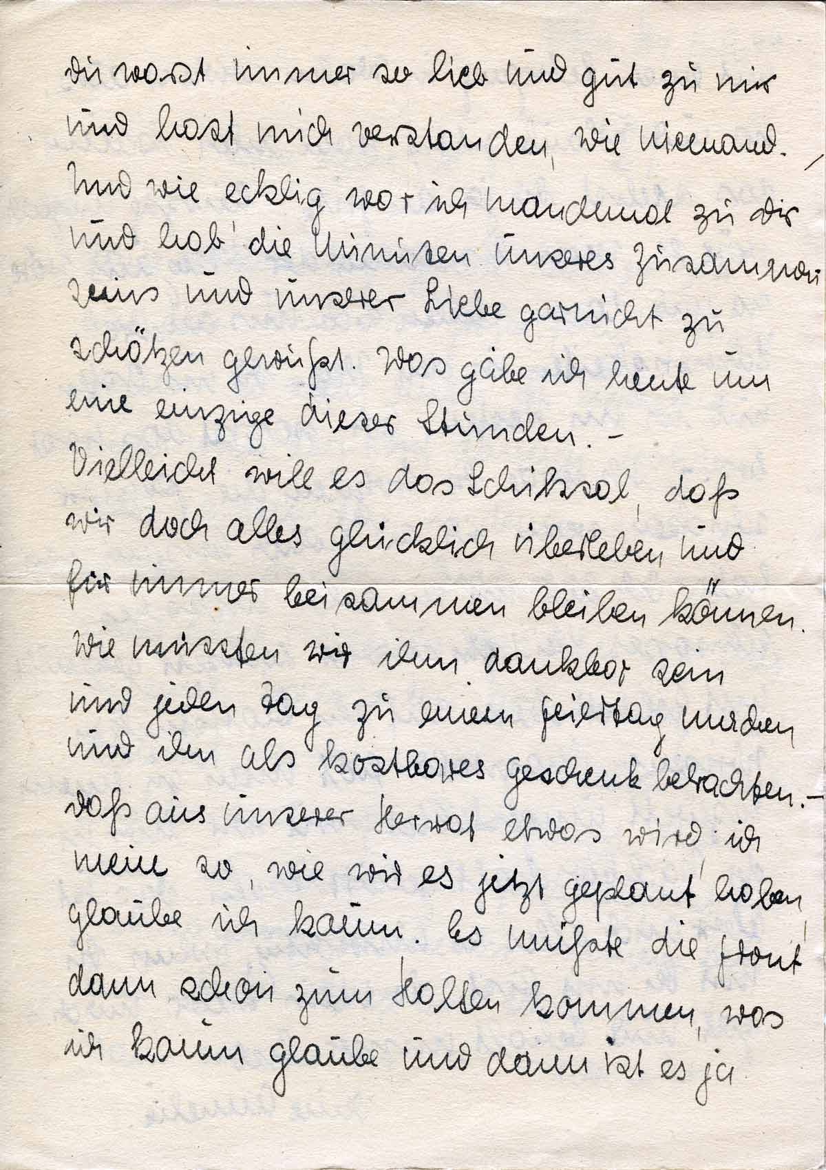 Vielleicht will es das Schicksal, daß wir doch alles glücklich überleben und für immer beisammen bleiben können. Wie müssten wir ihm dankbar sein und jeden Tag zu einem Feiertag machen und ihn als kostbares Geschenk betrachten. Daß aus unserer Heirat etwas wird, ich mein so, wie wir es jetzt geplant haben, glaube ich kaum. Es müßte die Front dann schon zum Halten kommen, was ich kaum glaube und dann ist es ja