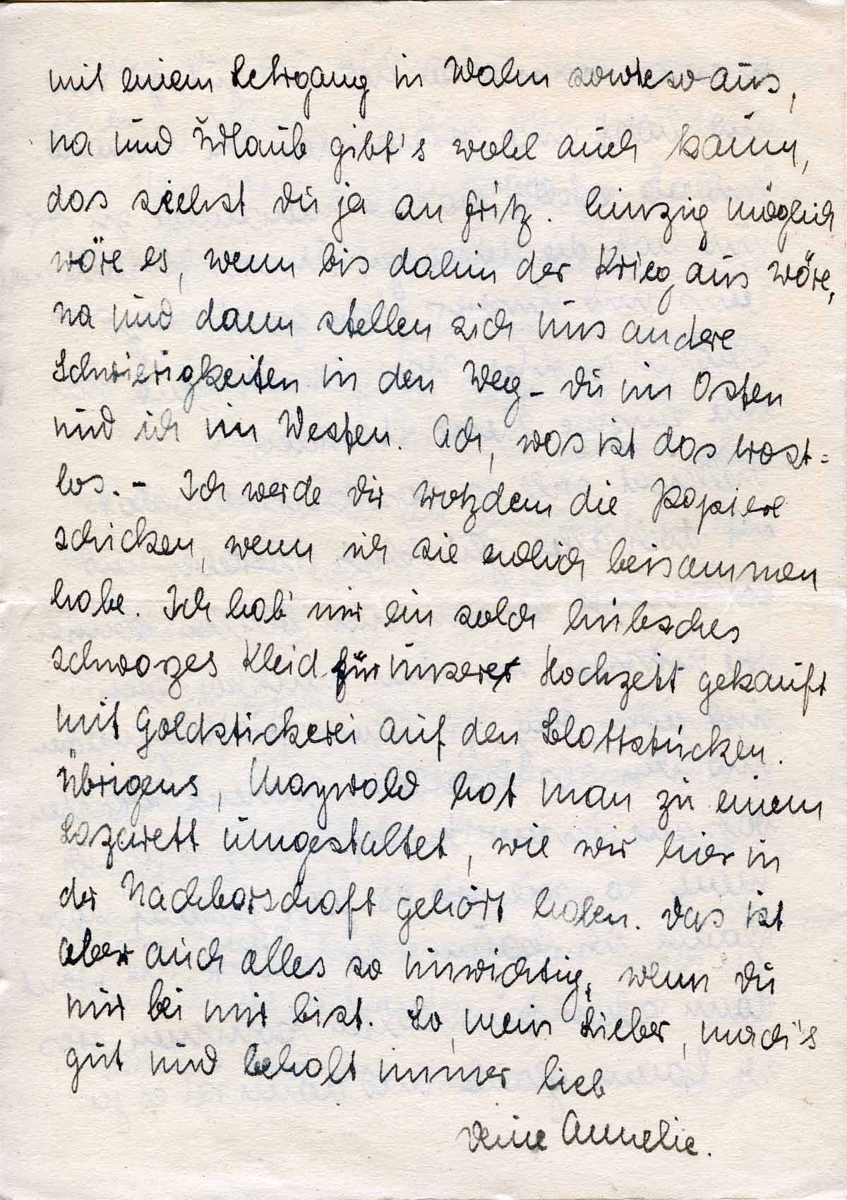 mit einem Lehrgang in Wahn sowieso aus, na und Urlaub gibt’s wohl auch kaum, das siehst Du ja an Fritz. Einzig möglich wäre es, wenn bis dahin der Krieg aus wäre, na und dann stellen sich uns andere Schwierigkeiten in den Weg - Du im Osten und ich im Westen. Ach, was ist das trostlos. - Ich werde Dir trotzdem die Papiere schicken, wenn ich sie endlich beisammen habe. Ich hab’ mir ein solch hübsches schwarzes Kleid für unsere Hochzeit gekauft mit Goldstickerei auf den Blattstücken. Übrigens, Maywald hat man zu einem Lazarett umgestaltet, wie wir hier in der Nachbarschaft gehört haben. Das ist aber auch alles so unwichtig, wenn Du nur bei mir bist. So, mein Lieber, mach’s gut und behalt immer lieb