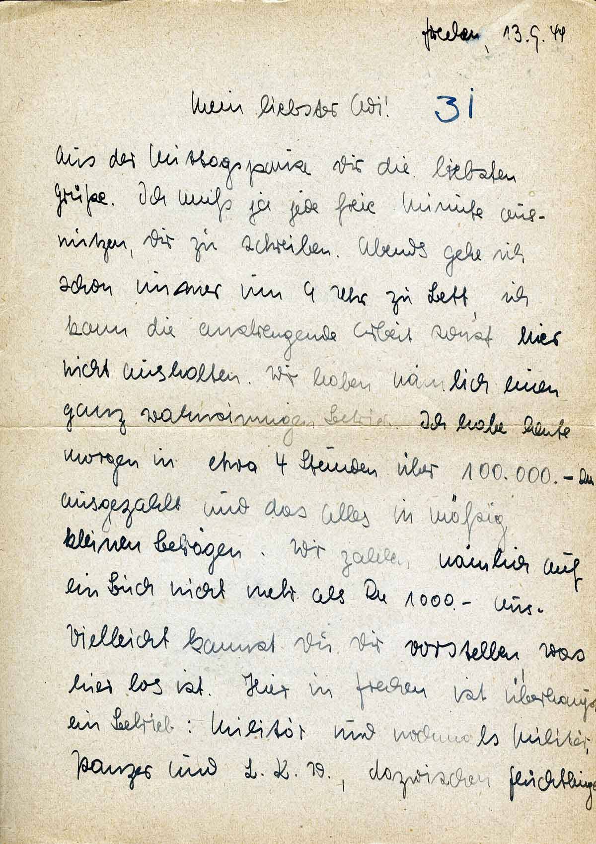 Aus der Mittagspause Dir die liebsten Grüße. Ich muß ja jede freie Minute ausnutzen, Dir zu schreiben. Abends gehe ich schon immer um 9 Uhr zu Bett, ich kann die anstrengende Arbeit sonst hier nicht aushalten. Wir haben nämlich einen ganz wahnsinnigen Betrieb. Ich habe heute morgen in etwa 4 Stunden über 100.000.-RM ausgezahlt und das alles in mäßig kleinen Beträgen. Wir zahlen nämlich auf ein Buch nicht mehr als RM 1000.- aus. Vielleicht kannst Du Dir vorstellen, was hier los ist. Hier in Frechen ist überhaupt ein Betrieb: Militär und nochmals Militär, Panzer und L.K.W., dazwischen Flüchtlinge