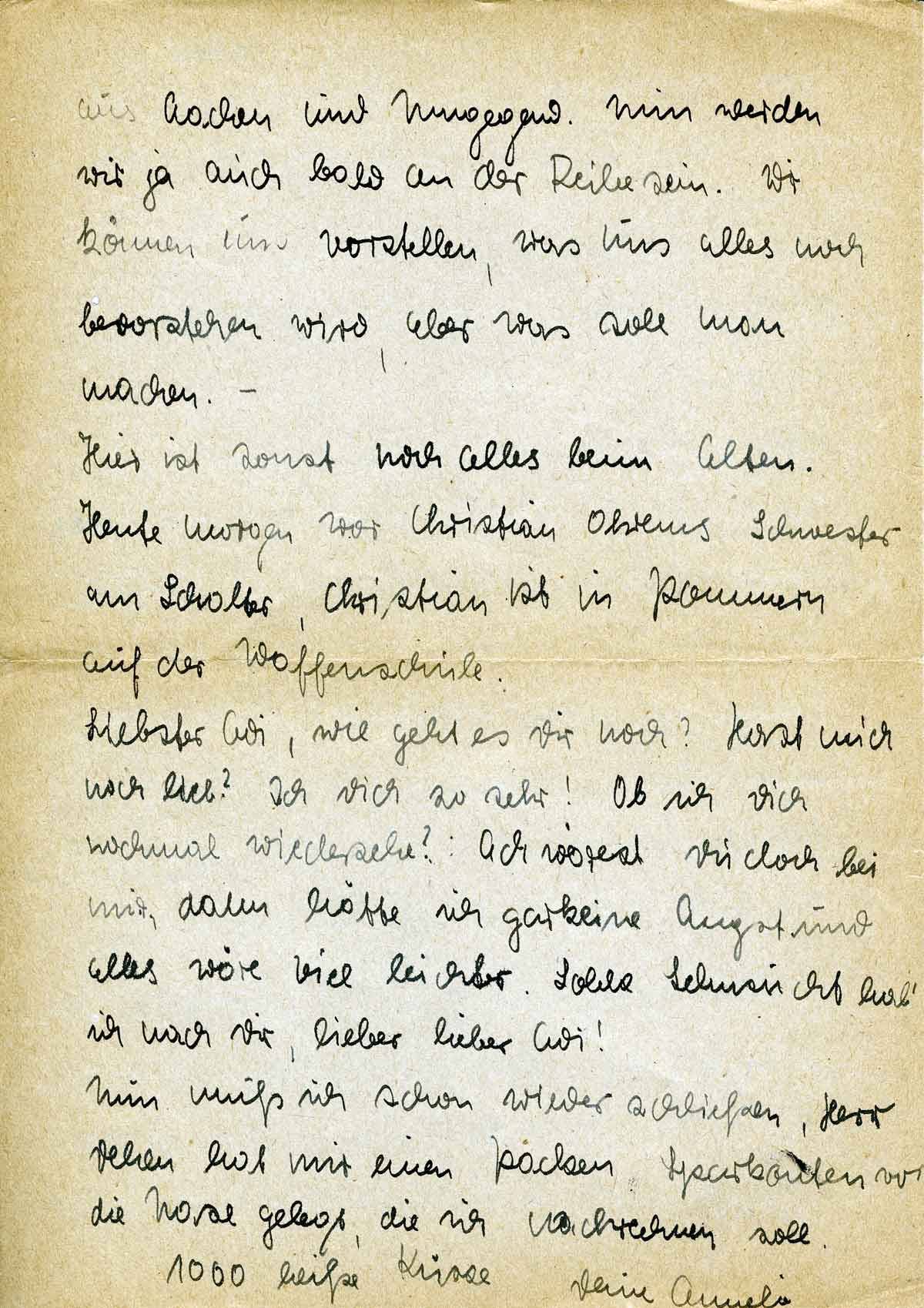 Liebster Adi, wie geht es Dir noch? Hast mich noch lieb? Ich Dich so sehr! Ob ich Dich nochmal wiedersehe? Ach wärest Du doch bei mir, dann hätte ich garkeine Angst und alles wäre viel leichter. Solche Sehnsucht hab’ ich nach Dir, lieber lieber Adi!