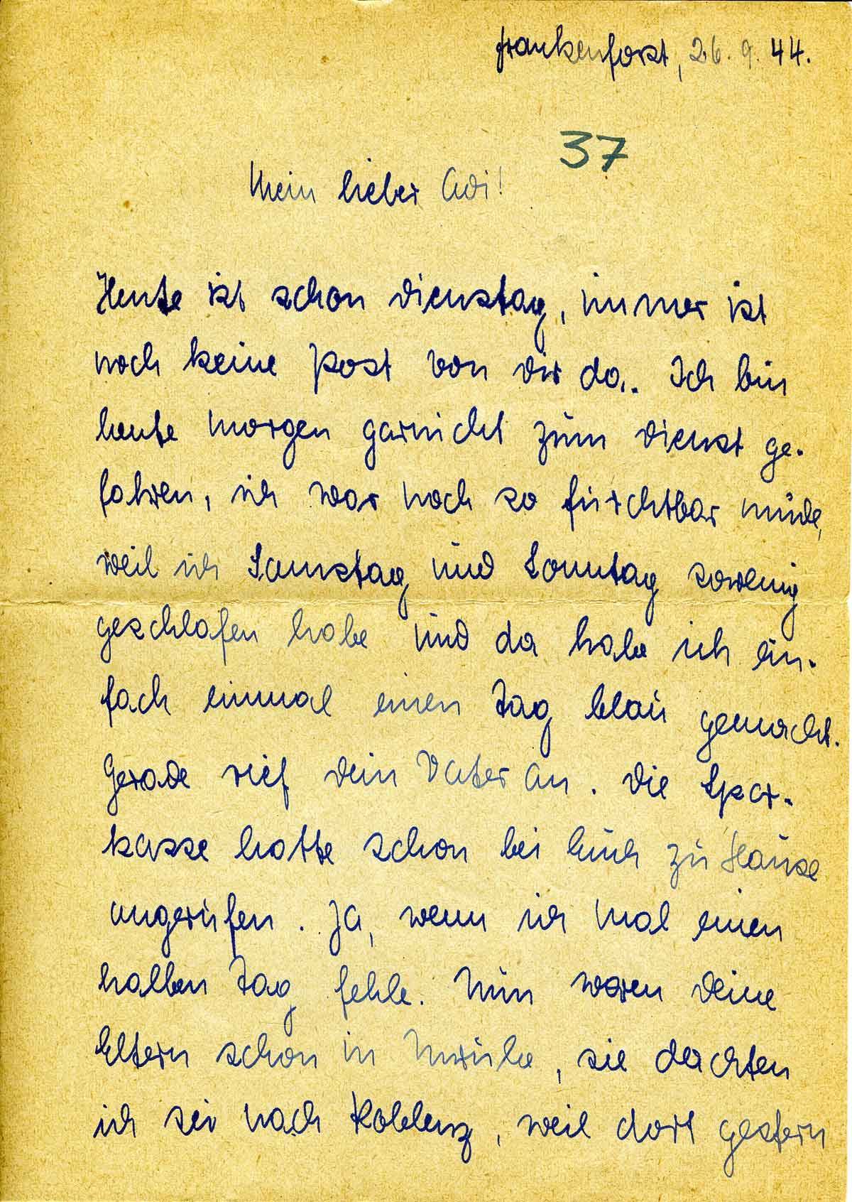 Heute ist schon Dienstag, immer ist noch keine Post von Dir da. Ich bin heute morgen garnicht zum Dienst gefahren, ich war noch so furchtbar müde, weil ich Samstag und Sonntag sowenig geschlafen habe und da habe ich einfach einmal einen Tag blau gemacht. Gerade rief Dein Vater an. Die Sparkasse hatte schon bei Euch zu Hause angerufen. Ja, wenn ich mal einen halben Tag fehle. Nun waren Deine Eltern schon in Unruhe, sie dachten ich sei nach Koblenz, weil dort gestern