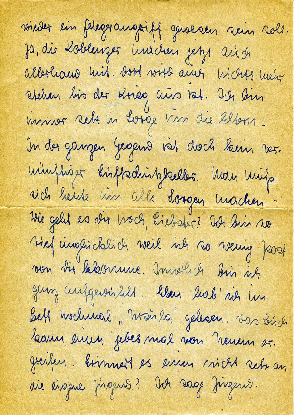 wieder ein Fliegerangriff gewesen sein soll. Ja, die Koblenzer machen jetzt auch allerhand mit. Dort wird auch nichts mehr stehen bis der Krieg aus ist. Ich bin immer sehr in Sorge um die Eltern.