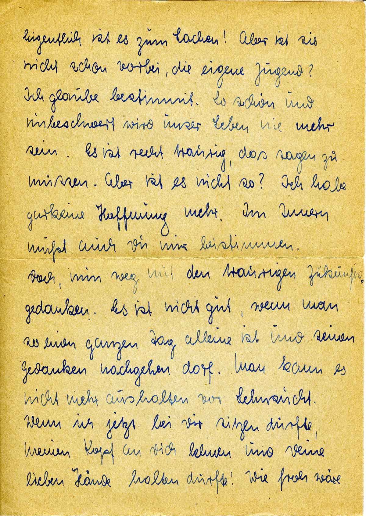 ich. Wann wird diese Qual einmal ein Ende nehmen? Wird sie überhaupt mal enden! Ach, Adschki Liebster, ich habe Dich so lieb, so schrecklich lieb! Dich zu verlieren, bedeutete für mich den Tod. Ich könnte garkeinen Menschen mehr lieben als Dich, dann müßte ich verbrennen. So heiß ist meine Liebe zu Dir. Hast mich auch lieb? Natürlich, dumme Frage! Aus jedem Deiner lieben Briefe fühle ich das heraus. Nur fragen muß ich immer und immer wieder könnt’ ich’s hören. Jetzt wirst Du mich vielleicht auslachen und sagen, was hat mein Mädchen heute doch für Anwandlungen! Ach Adi, ich bin doch so schrecklich unglücklich! Kannst Du das denn nicht verstehen?