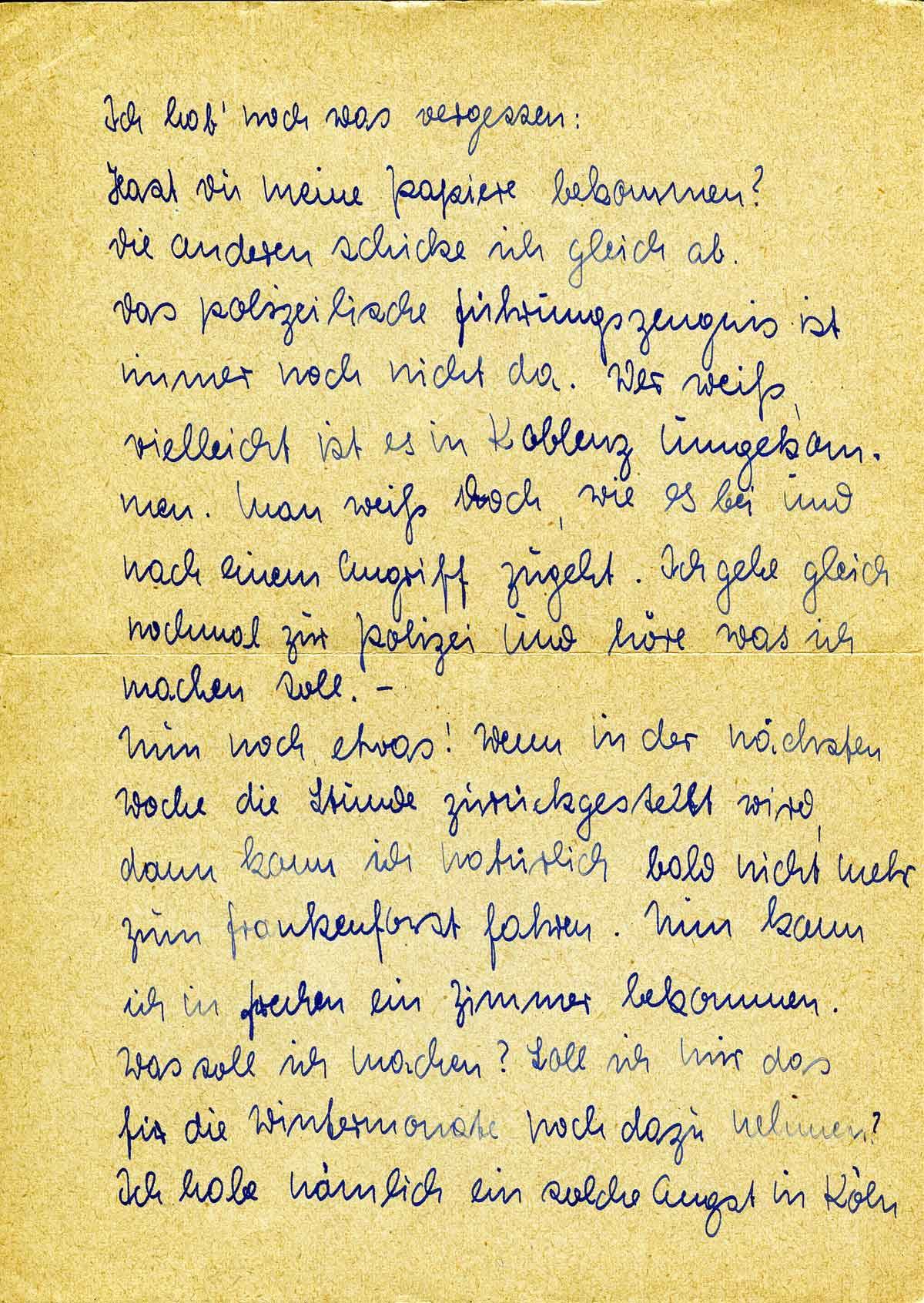 Das polizeiliche Führungszeugnis ist immer noch nicht da. Wer weiß, vielleicht ist es in Koblenz umgekommen. Man weiß doch, wie es bei und nach einem Angriff zugeht. Ich gehe gleich nochmal zur Polizei und höre was ich machen soll. -