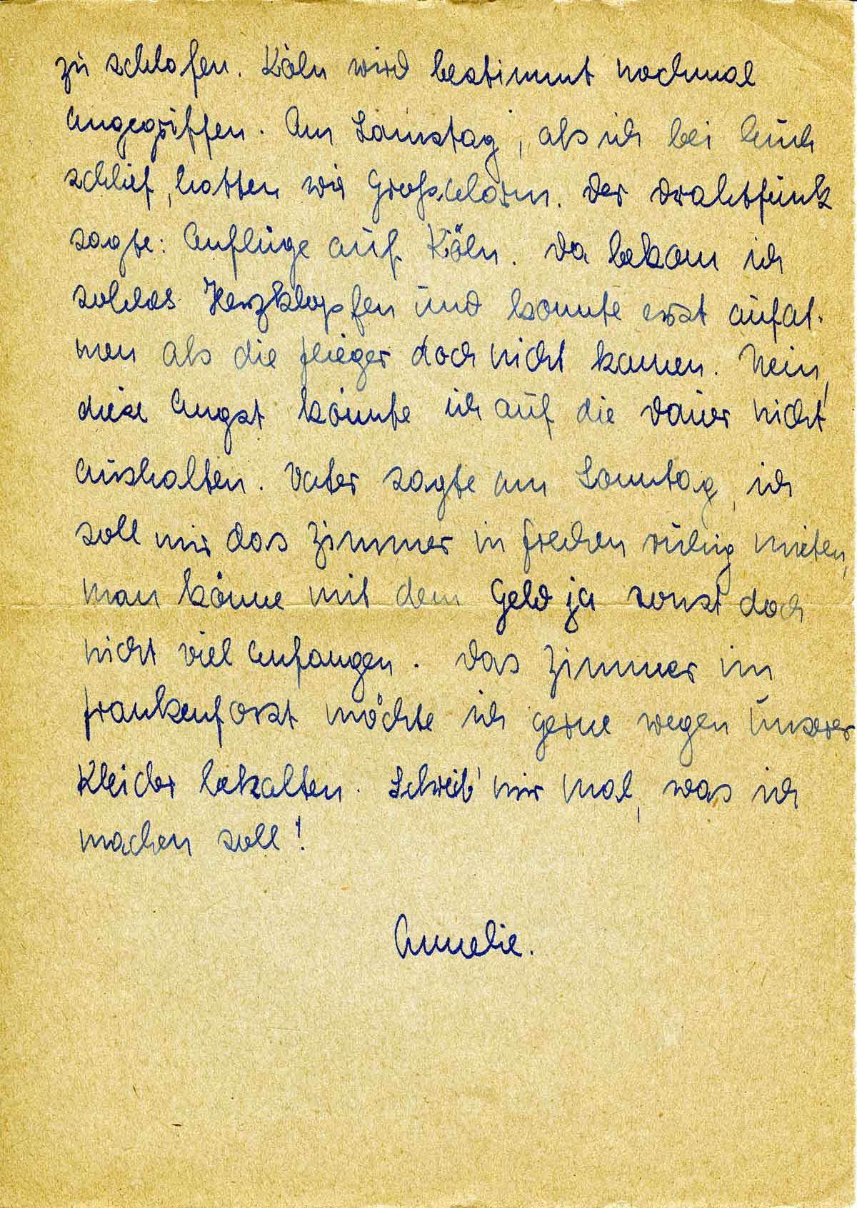 zu schlafen. Köln wird bestimmt nochmal angegriffen. Am Samstag, als ich bei Euch schlief, hatten wir Großalarm. Der Drahtfunk sagte: Anflüge auf Köln. Da bekam ich solches Herzklopfen und konnte erst aufatmen als die Flieger doch nicht kamen. Nein, diese Angst könnte ich auf die Dauer nicht aushalten. Vater sagte am Sonntag, ich soll mir das Zimmer in Frechen ruhig mieten, man könne mit dem Geld ja sonst doch nicht viel anfangen. Das Zimmer im Frankenforst möchte ich gerne wegen unserer Kleider behalten. Schreib’ mir mal, was ich machen soll!