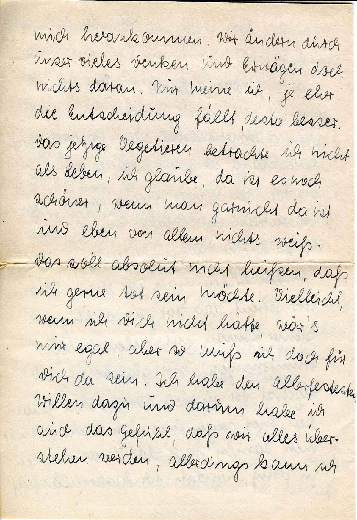 mich herankommen. Wir ändern durch unser vieles Denken und Erwägen doch nichts daran. Nur meine ich, je eher die Entscheidung fällt, desto besser. Das jetzige Vegetieren betrachte ich nicht als Leben, ich glaube, da ist es noch schöner, wenn man garnicht da ist und eben von allem nichts weiß.
