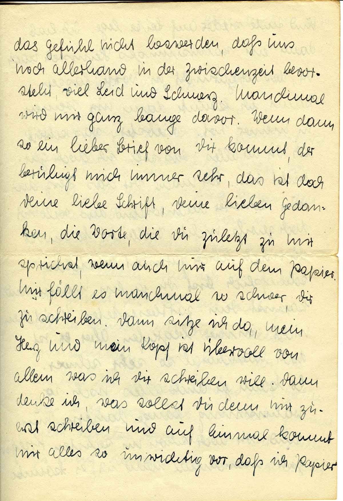 das Gefühl nicht loswerden, daß uns noch allerhand in der Zwischenzeit bevorsteht viel Leid und Schmerz. Manchmal wird mir ganz bange davor. Wenn dann so ein lieber Brief von Dir kommt, der beruhigt mich immer sehr, das ist doch Deine liebe Schrift, Deine lieben Gedanken, die Worte, die Du zuletzt zu mir sprichst, wenn auch nur auf dem Papier. Mir fällt es manchmal so schwer, Dir zu schreiben. Dann sitze ich da, mein Herz und mein Kopf ist übervoll von allem was ich Dir schreiben will. Dann denke ich, was sollst Du denn nur zuerst schreiben und auf einmal kommt mir alles so unwichtig vor, daß ich Papier