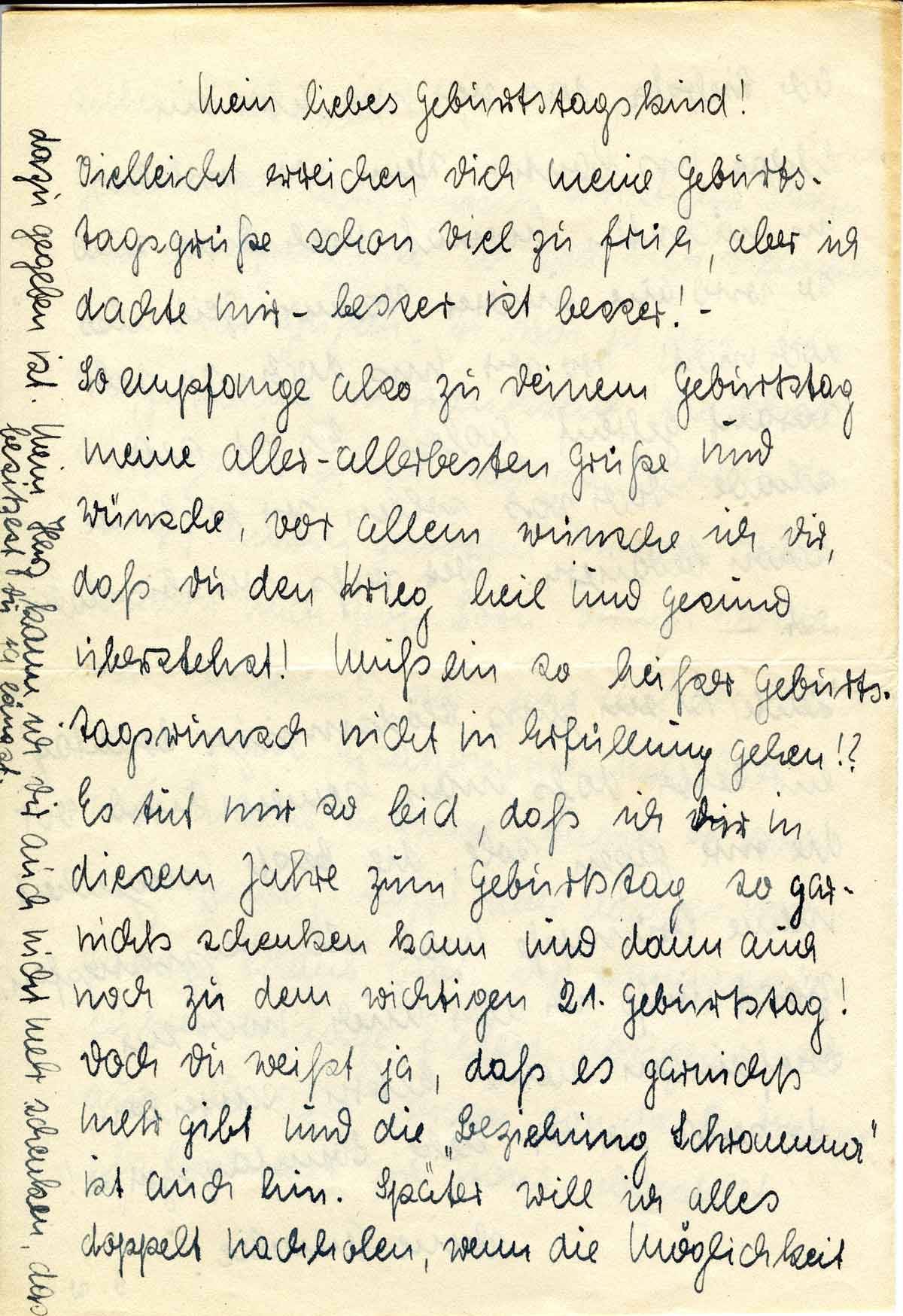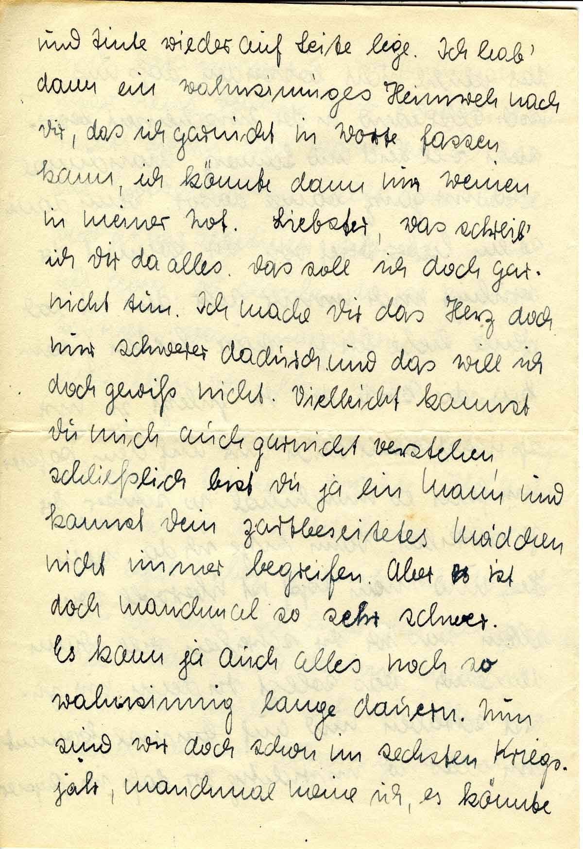 und Tinte wieder auf die Seite lege. Ich hab’ dann ein wahnsinniges Heimweh nach Dir, das ich garnicht in Worte fassen kann, ich könnte dann nur weinen in meiner Not. Liebster, was schreib’ ich Dir da alles. Das soll ich doch garnicht tun. Ich mache Dir das Herz doch nur schwerer dadurch und das will ich doch gewiß nicht. Vielleicht kannst Du mich auch garnicht verstehen, schließlich bist Du ja ein Mann und kannst Dein zartbeseitetes Mädchen nicht immer begreifen. Aber es ist doch manchmal so sehr schwer. Es kann ja auch alles noch so wahnsinnig lange dauern. Nun sind wir doch schon im sechsten Kriegsjahr, manchmal meine ich, es könnte