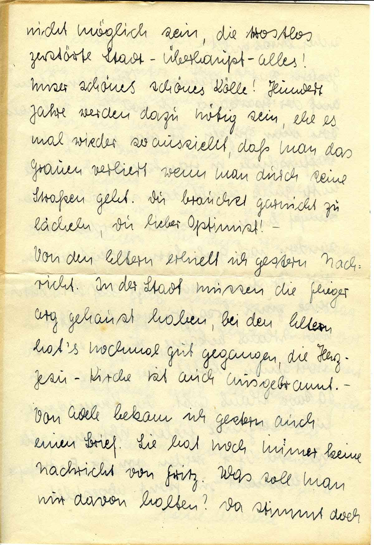 nicht möglich sein, die trostlos zerstörte Stadt - überhaupt - alles! Unser schönes schönes Kölle! Hundert Jahre werden dazu nötig sein, ehe es mal wieder so aussieht, daß man das Grauen verliert wenn man durch seine Straßen geht. Du brauchst garnicht zu lächeln, Du lieber Optimist! -