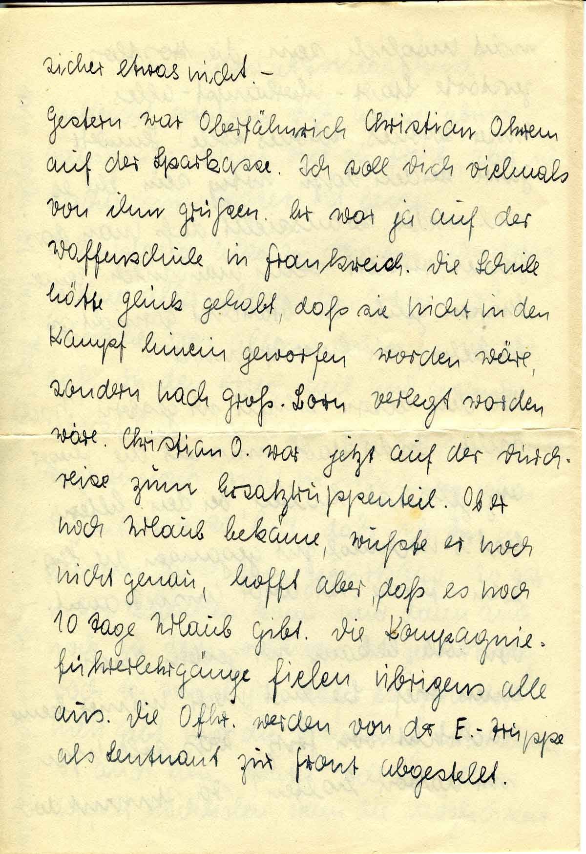 Gestern war Oberfähnrich Christian Ohren auf der Sparkasse. Ich soll Dich vielmals von ihm grüßen. Er war ja auf der Waffenschule in Frankreich. Die Schule hätte Glück gehabt, daß sie nicht in den Kampf hinein geworfen worden wäre, sondern nach Groß. Born verlegt worden wäre. Christian O. war jetzt auf der Durchreise zum Ersatztruppenteil. Ob er noch Urlaub bekäme, wußte er noch nicht genau, hofft aber, daß es noch 10 Tage Urlaub gibt. Die Kompagnieführerlehrgänge fielen übrigens alle aus. Die Ofhr. werden von der E.-Truppe als Leutnant zur Front abgestellt.
