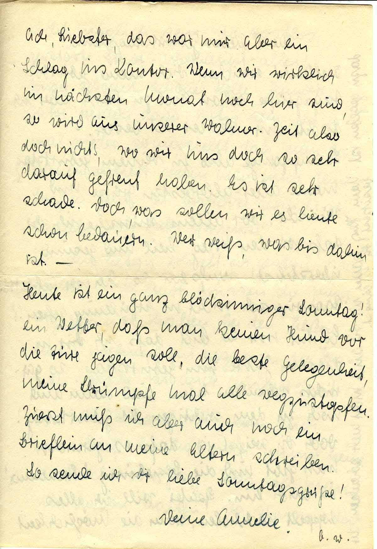 Heute ist ein ganz blödsinniger Sonntag! Ein Wetter, daß man keinen Hund vor die Türe jagen soll, die beste Gelegenheit, meine Strümpfe mal alle wegzustopfen. Zuerst muß ich aber auch noch ein Brieflein an meine Eltern schreiben.