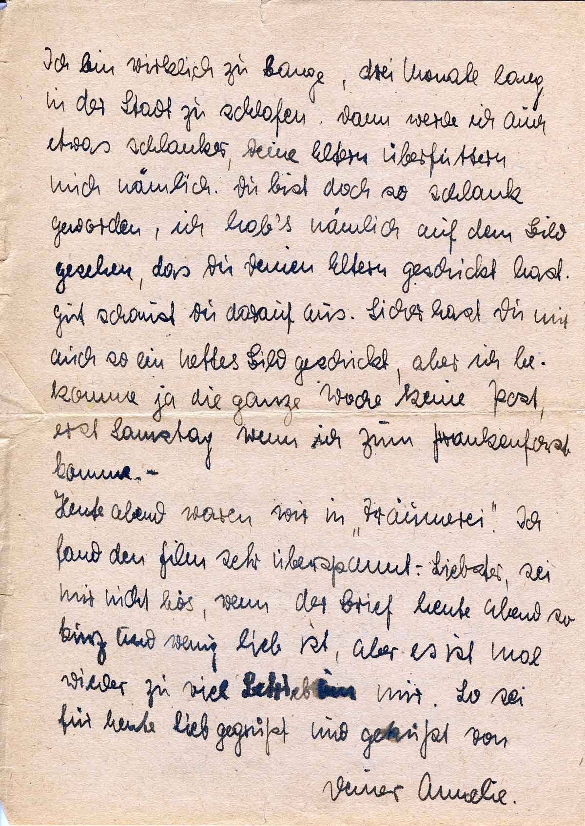 Heute abend waren wir in „Träumerei“. Ich fand den Film sehr überspannt. - Liebster, sei mir nicht bös, wenn der Brief heute abend so kurz und wenig lieb ist, aber es ist mal wieder zu viel Betrieb um mir. So sei für heute lieb gegrüßt und geküßt von