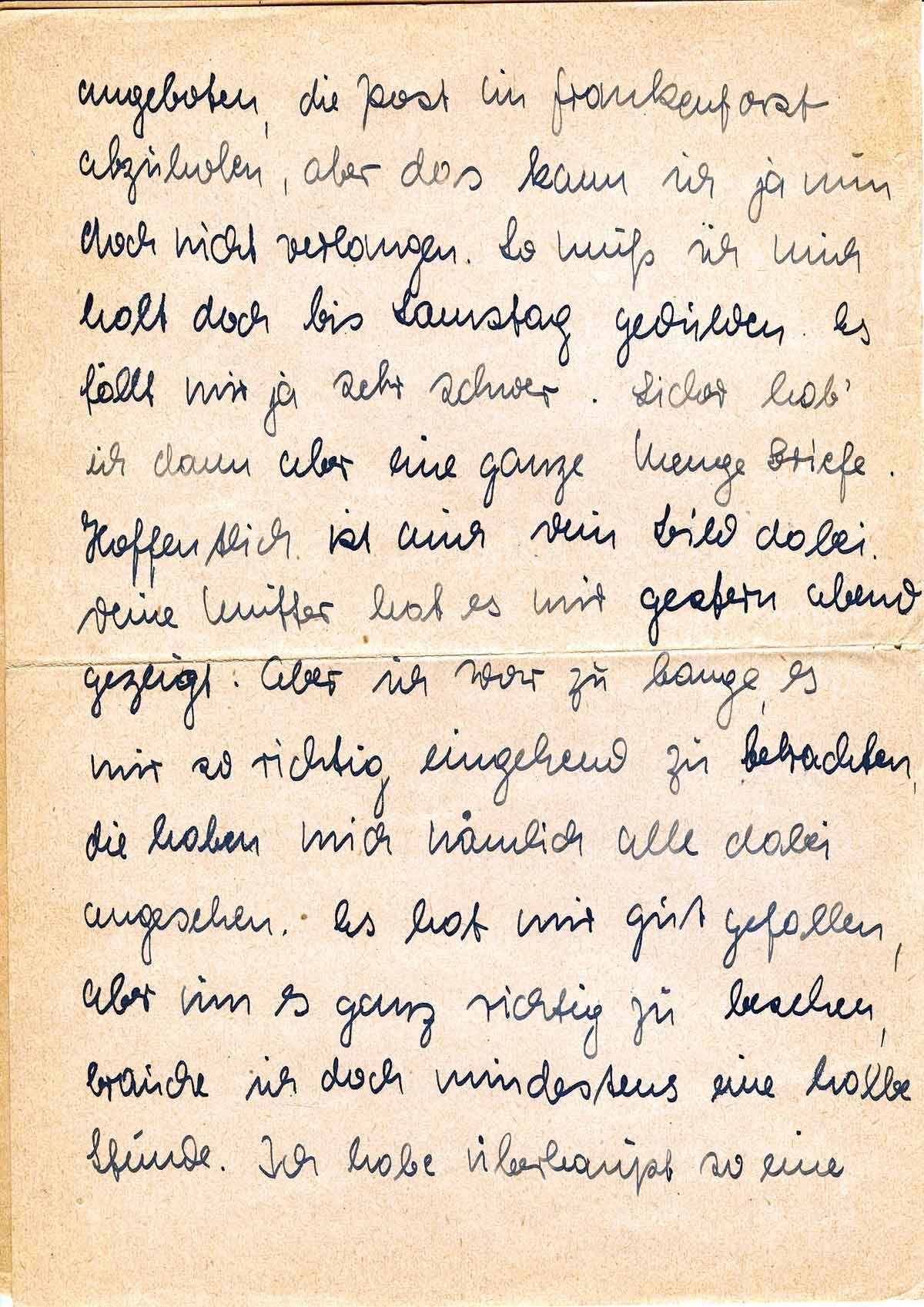 angeboten, die Post im Frankenforst abzuholen, aber das kann ich ja nun doch nicht verlangen. So muß ich mich halt doch bis Samstag gedulden. Es fällt mir ja sehr schwer. Sicher hab’ ich dann aber eine ganze Menge Briefe. Hoffentlich ist auch Dein Bild dabei. Deine Mutter hat es mir gestern abend gezeigt. Aber ich war zu bange, es mir so richtig eingehend zu betrachten, die haben mich nämlich alle dabei angesehen. Es hat mir gut gefallen, aber um es ganz richtig zu besehen, brauche ich doch mindestens eine halbe Stunde. Ich habe überhaupt so eine