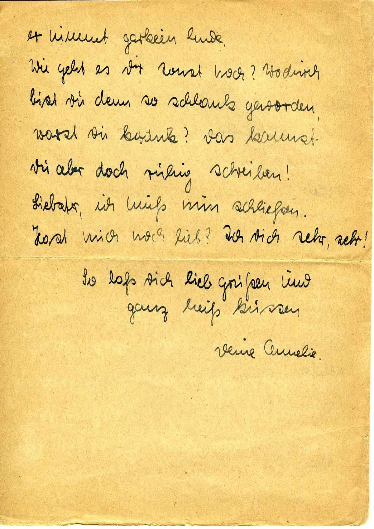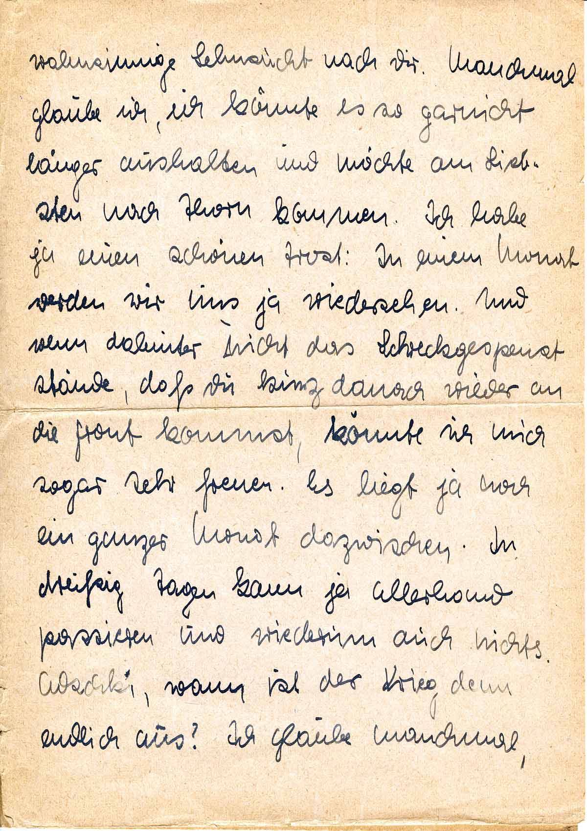 wahnsinnige Sehnsucht nach Dir. Manchmal glaube ich, ich könnte es so garnicht länger aushalten und möchte am Liebsten nach Thorn kommen. Ich habe ja einen schönen Trost: In einem Monat werden wir uns ja wiedersehen. Und wenn dahinter nicht das Schreckgespenst stände, daß Du kurz danach wieder an die Front kommst, könnte ich mich sogar sehr freuen. Es liegt ja noch ein ganzer Monat dazwischen. In dreißig Tagen kann ja allerhand passieren und wiederum auch nichts. Adschki, wann ist der Krieg denn endlich aus? Ich glaube manchmal,
