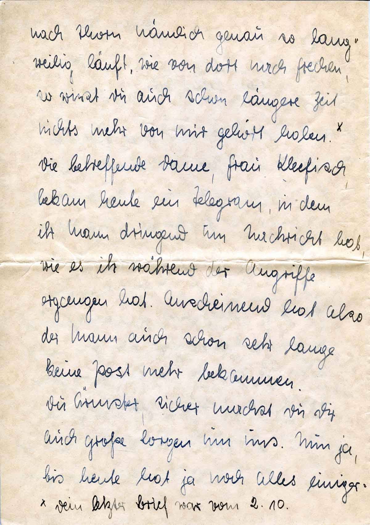 nach Thorn nämlich genau so langweilig läuft, wie von dort nach Frechen, so wirst Du auch schon längere Zeit nichts mehr von mir gehört haben. Dein letzter Brief war vom 2.10. Die betreffende Dame, Frau Kleefisch, bekam heute ein Telegram, in dem ihr Mann dringend um Nachricht bat, wie es ihr während der Angriffe ergangen hat. Anscheinend hat also der Mann auch schon sehr lange keine Post mehr bekommen.