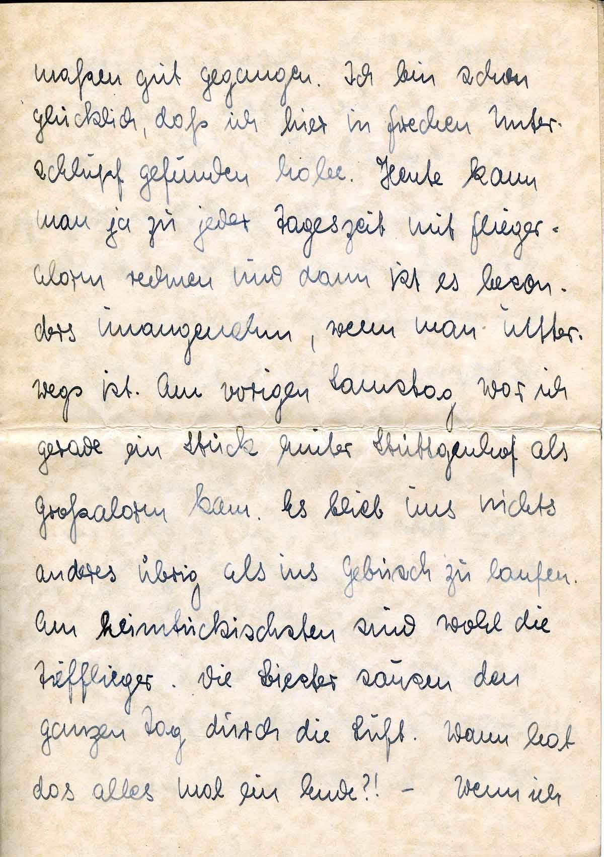 maßen gut gegangen. Ich bin schon glücklich, daß ich hier in Frechen Unterschlupf gefunden habe. Heute kann man ja zu jeder Tageszeit mit Fliegeralarm rechnen und dann ist es besonders unangenehm, wenn man unterwegs ist. Am vorigen Samstag war ich gerade ein Stück hinter Stüttgenhof als Großalarm kam. Es blieb uns nichts anderes übrig als ins Gebüsch zu laufen. Am heimtückischsten sind wohl die Tiefflieger. Die Biester sausen den ganzen Tag durch die Luft. Wann hat das alles mal ein Ende?! - Wenn ich