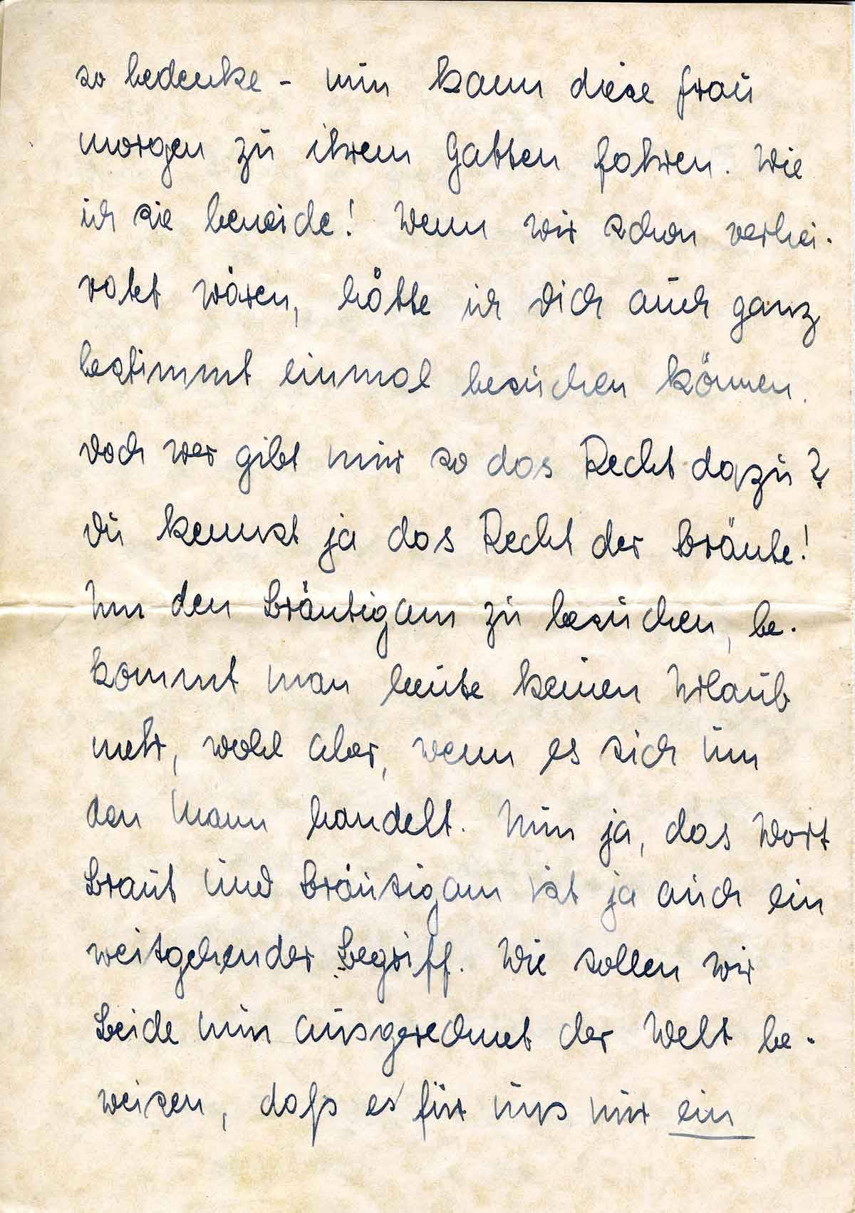 so bedenke - nun kann diese Frau morgen zu ihrem Gatten fahren. Wie ich sie beneide! Wenn wir schon verheiratet wären, hätte ich Dich auch ganz bestimmt einmal besuchen können. Doch wer gibt mir so das Recht dazu? Du kennst ja das Recht der Bräute! Um den Bräutigam zu besuchen, bekommt man heute keinen Urlaub mehr, wohl aber, wenn es sich um den Mann handelt. Nun ja, das Wort Braut und Bräutigam ist ja auch ein weitgehender Begriff. Wie sollen wir Beide nun ausgerechnet der Welt beweisen, daß es für uns nur ein