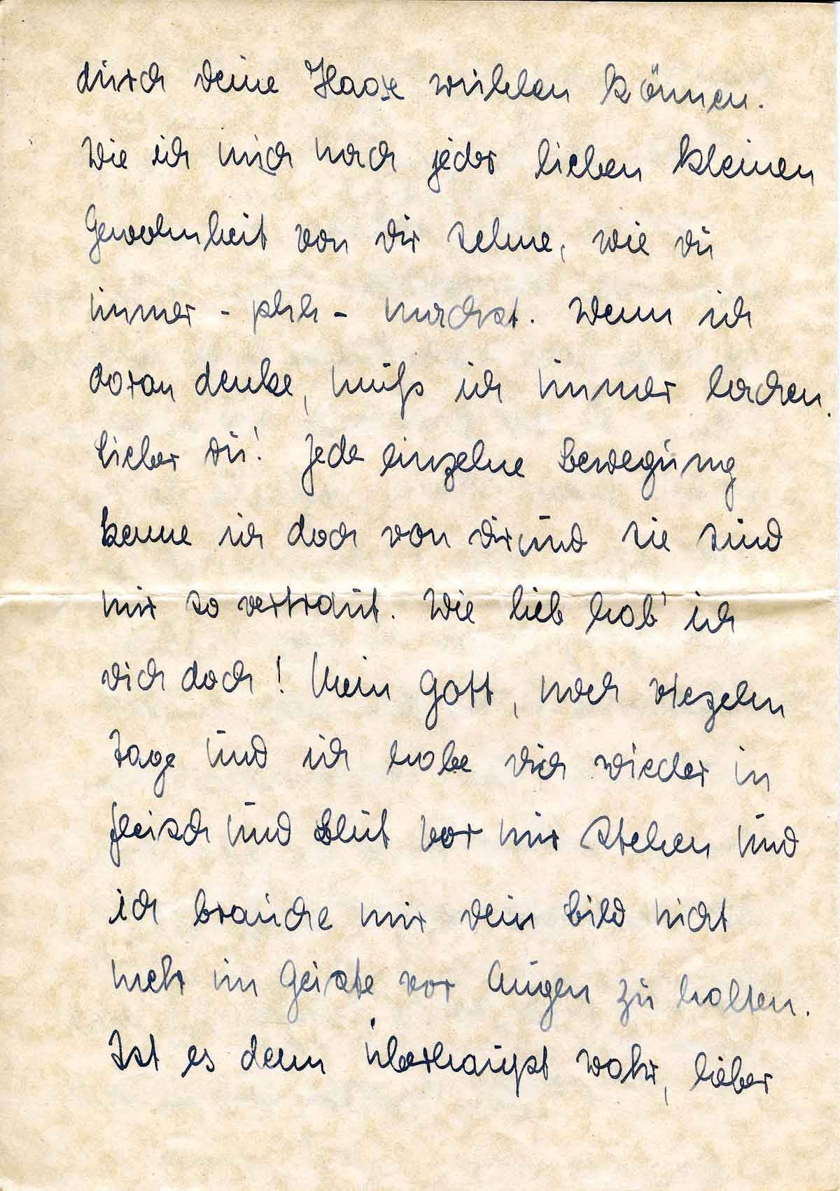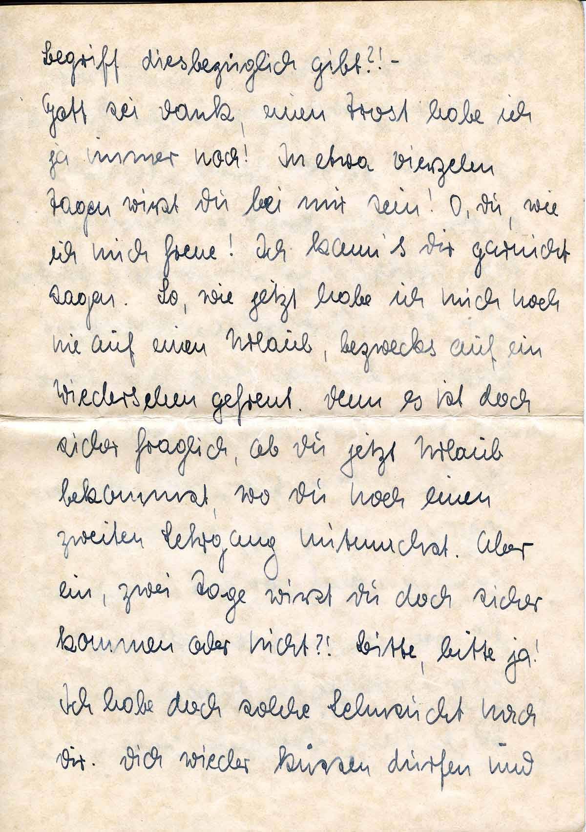 Gott sei Dank, einen Trost habe ich ja immer noch! In etwa vierzehn Tagen wirst Du bei mir sein! O, Du, wie ich mich freue! Ich kann’s Dir garnicht sagen. So, wie jetzt habe ich mich noch nie auf einen Urlaub, bezwecks[!] auf ein Wiedersehen gefreut. Denn es ist doch sicher fraglich, ob Du jetzt Urlaub bekommst, wo Du noch einen zweiten Lehrgang mitmachst. Aber ein, zwei Tage wirst Du doch sicher kommen oder nicht?! Bitte, bitte ja!