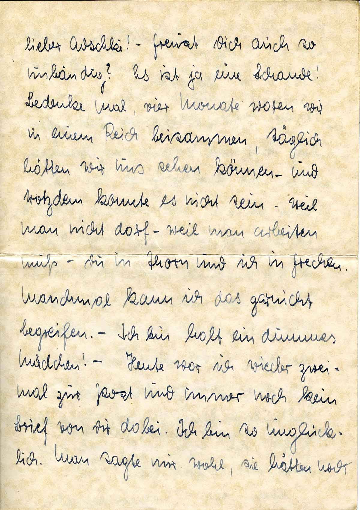 lieber Adschki! - Freust Dich auch so unbändig? Es ist ja eine Schande! Bedenke mal, vier Monate waren wir in einem Reich beisammen, täglich hätten wir uns sehen können - und trotzdem konnte es nicht sein - weil man nicht darf - weil man arbeiten muß - Du in Thorn und ich in Frechen. Manchmal kann ich das garnicht begreifen. - Ich bin halt ein dummes Mädchen! - Heute war ich wieder zweimal zur Post und immer noch kein Brief von Dir dabei. Ich bin so unglücklich. Man sagte mir wohl, sie hätten noch