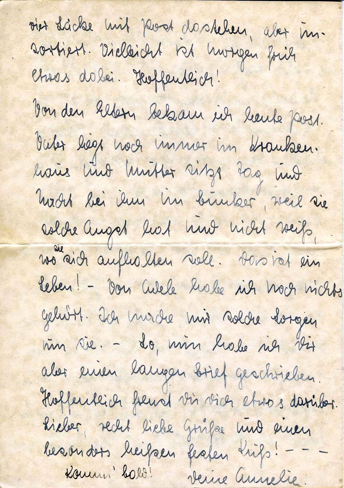 Von den Eltern bekam ich heute Post. Vater liegt noch immer im Krankenhaus und Mutter sitzt Tag und Nacht bei ihm im Bunker, weil sie solche Angst hat und nicht weiß, so sie sich aufhalten soll. Das ist ein Leben! - Von Adele habe ich noch nichts gehört. Ich mache mir solche Sorgen um sie. - So, nun habe ich Dir aber einen langen Brief geschrieben. Hoffentlich freust Du Dich etwas darüber.