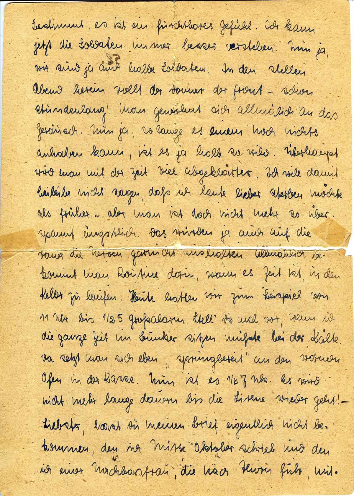 Bestimmt, es ist ein furchtbares Gefühl. Ich kann jetzt die Soldaten immer besser verstehen. Nun ja, wir sind ja auch halbe Soldaten. In den stillen Abend herein rollt der Donner der Front - schon stundenlang! Man gewöhnt sich allmählich an das Geräusch. Nun ja, solange es einem noch nichts anhaben kann, ist es ja halb so wild. Überhaupt wird man mit der Zeit viel abgeklärter. Ich will damit beileibe nicht sagen, daß ich heute lieber sterben möchte als früher - aber man ist doch nicht mehr so überspannt ängstlich. Das würden ja auch auf die Dauer die Nerven garnicht aushalten. Allmählich bekommt man Routine darin, wann es Zeit ist, in den Keller zu laufen. Heute hatten wir zum Beispiel von 11 Uhr bis ½ 5 Großalarm. Stell’ Dir mal vor, wenn ich die ganze Zeit im Bunker sitzen müßte bei der Kälte. Da setzt man sich eben „sprungbereit“ an den warmen Ofen in der Kasse. Nun ist es ½ 7 Uhr. Es wird nicht mehr lange dauern bis die Sirene wieder geht! -