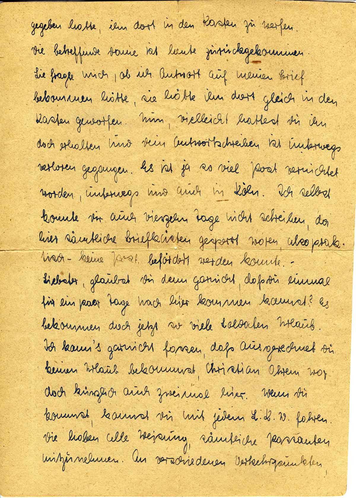 Die betreffende Dame ist heute zurückgekommen. Sie fragte mich, ob ich Antwort auf meinen Brief bekommen hätte, sie hätte ihn dort gleich in den Kasten geworfen. Nun, vielleicht hattest Du ihn doch erhalten und Dein Antwortschreiben ist unterwegs verloren gegangen. Es ist ja so viel Post vernichtet worden, unterwegs und auch in Köln. Ich selbst konnte Dir auch vierzehn Tage nicht schreiben, da hier sämtliche Briefkästen gesperrt waren, also praktisch - keine Post befördert werden konnte. -