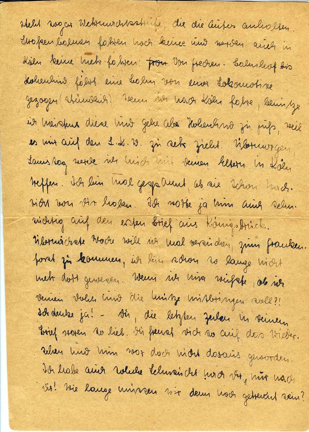 steht sogar Wehrmachtsstreife, die die Autos anhalten. Straßenbahnen fahren noch keine und werden auch in Köln keine mehr fahren. Von Frechen-Bahnhof bis Hohenlind fährt eine Bahn von einer Lokomotive gezogen (stündlich). Wenn ich nach Köln fahre, benutze ich meistens diese und gehe ab Hohenlind zu Fuß, weil es mir auf den L.K.W. zu sehr zieht. Übermorgen, Samstag werde ich mich mit Deinen Eltern in Köln treffen. Ich bin mal gespannt, ob sie schon Nachricht von Dir haben. Ich warte ja nun auch sehnsüchtig auf den ersten Brief aus Königsbrück.