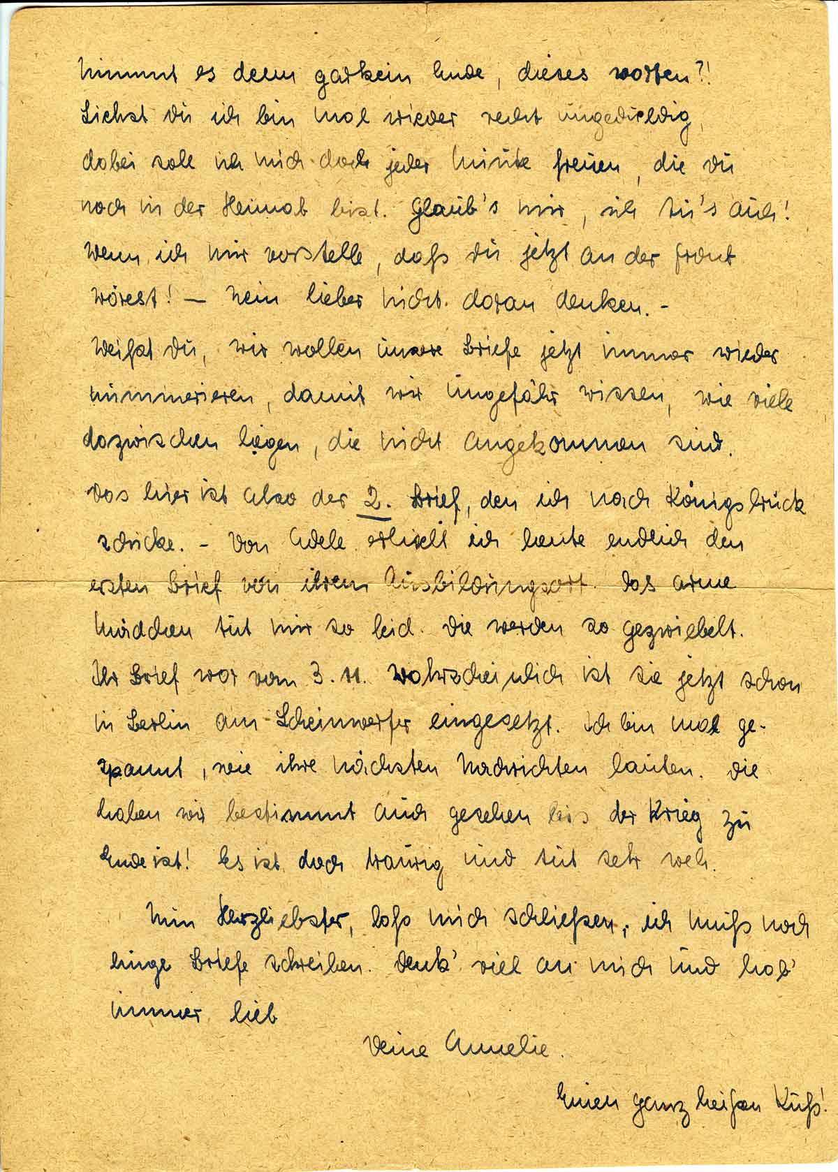 Das hier ist also der 2. Brief, den ich nach Königsbrück schicke. - Von Adele erhielt ich heute endlich den ersten Brief von ihrem Ausbildungsort. Das arme Mädchen tut mir so leid. Die werden so gezwiebelt. Ihr Brief war vom 3.11. Wahrscheinlich ist sie jetzt schon in Berlin am Scheinwerfer eingesetzt. Ich bin mal gespannt, wie ihre nächsten Nachrichten lauten. Die haben wir bestimmt auch gesehen bis der Krieg zu Ende ist! Es ist doch traurig und tut sehr weh.