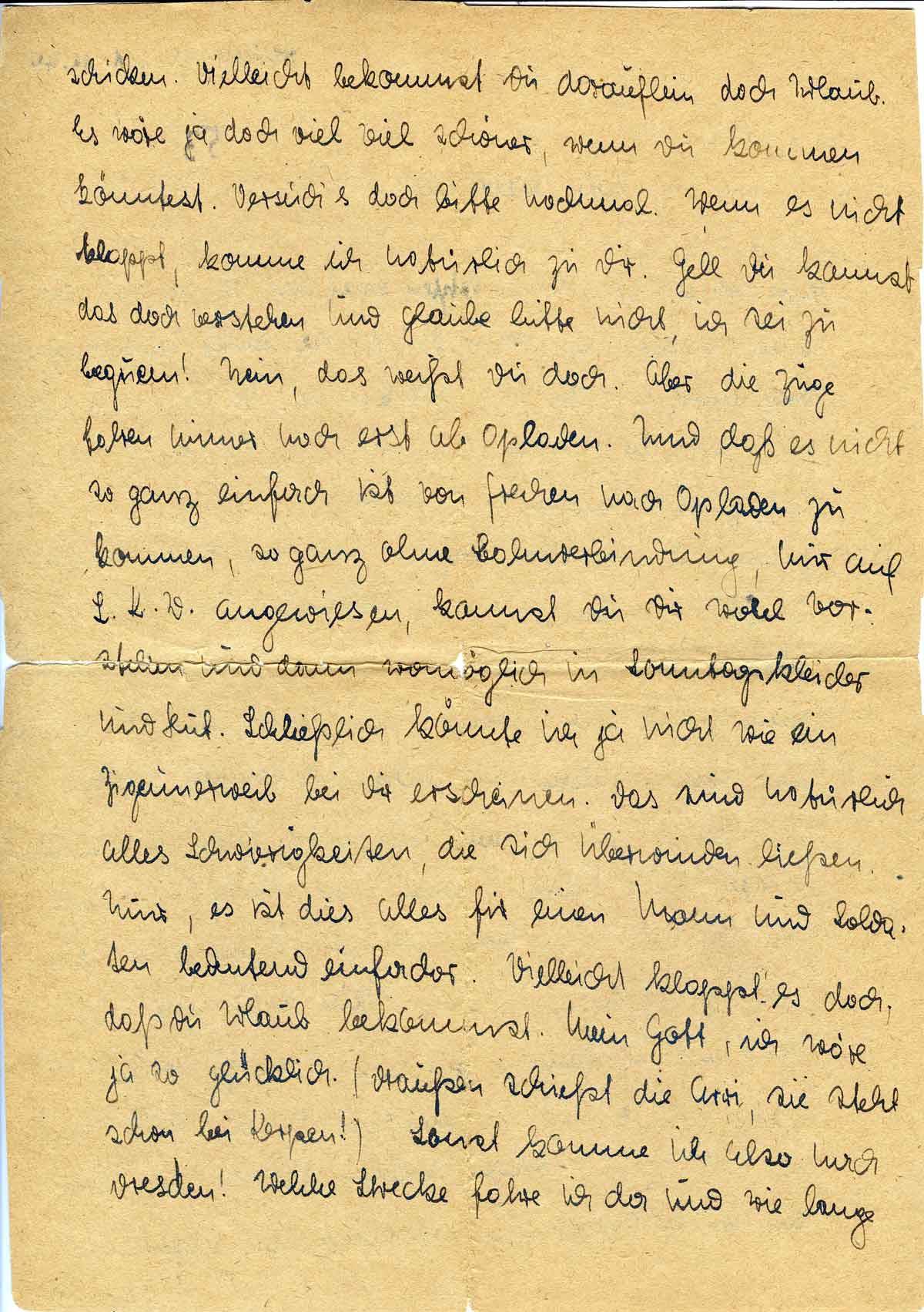 schicken. Vielleicht bekommst Du daraufhin doch Urlaub. Es wäre ja doch viel viel schöner, wenn Du kommen könntest. Versuch’s doch bitte nochmal. Wenn es nicht klappt, komme ich natürlich zu Dir. Gell Du kannst das doch verstehen und glaube bitte nicht, ich sei zu bequem! Nein, das weißt Du doch. Aber die Züge fahren immer noch erst ab Opladen. Und daß es nicht so ganz einfach ist von Frechen nach Opladen zu kommen, so ganz ohne Bahnverbindung, nur auf L.K.W. angewiesen, kannst Du Dir wohl vorstellen und dann womöglich in Sonntagskleider und Hut. Schließlich könnte ich ja nicht wie ein Zigeunerweib bei Dir erscheinen. Das sind natürlich alles Schwierigkeiten, die sich überwinden ließen. Nur, es ist dies alles für einen Mann und Soldaten bedeutend einfacher. Vielleicht klappt es doch, daß Du Urlaub bekommst. Mein Gott, ich wäre ja so glücklich. (Draußen schießt die Arri, sie steht schon bei Kerpen!) Sonst komme ich also Dresden! Welche Strecke fahre ich da und wie lange
