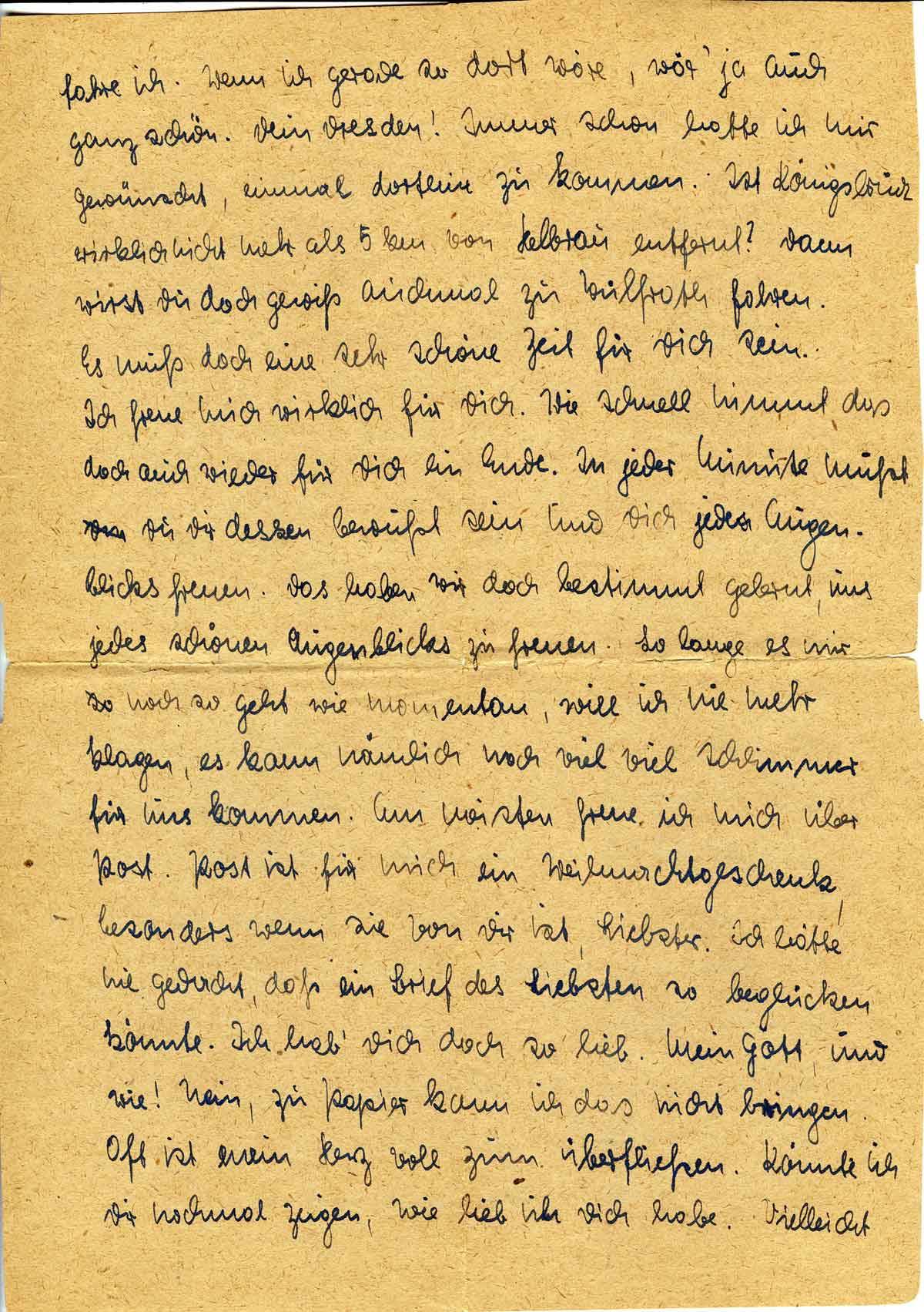 Ich freue mich wirklich für Dich. Wie schnell nimmt das doch auch wieder für Dich ein Ende. In jeder Minute mußt Du Dir dessen bewußt sein und Dich jeden Augenblicks freuen. Das haben wir doch bestimmt gelernt, uns jedes schönen Augenblicks zu freuen. So lange es mir noch so geht wie momentan, will ich nie mehr klagen, es kann nämlich noch viel viel schlimmer für uns kommen. Am meisten freue ich mich über Post. Post ist für mich ein Weihnachtsgeschenk, besonders wenn sie von Dir ist, Liebster. Ich hätte nie gedacht, daß ein Brief des Liebsten so beglücken könnte. Ich hab’ Dich doch so lieb. Mein Gott, und wie! Nein, zu Papier kann ich das nicht bringen. Oft ist mein Herz voll zum überfließen. Könnte ich Dir nochmal zeigen, wie lieb ich Dich habe. Vielleicht