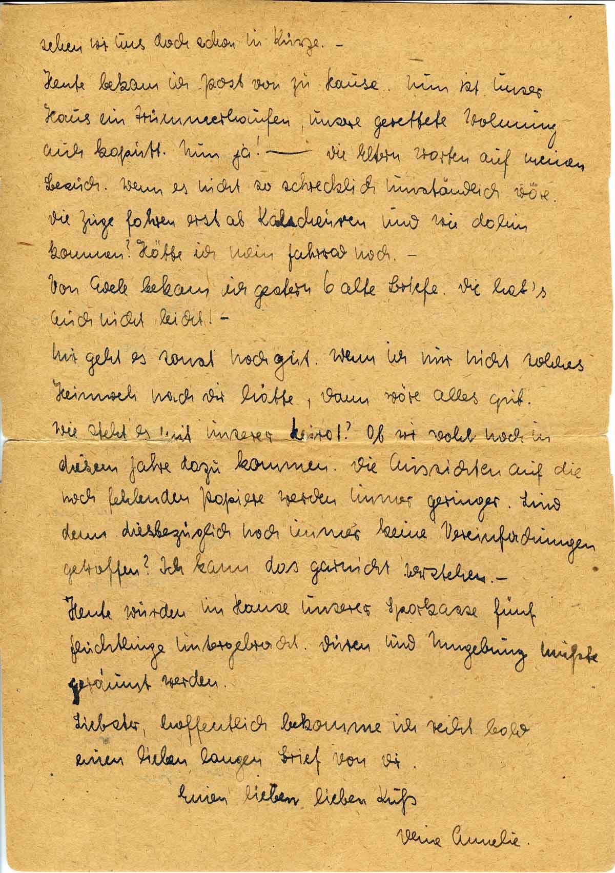 Mir geht es sonst noch gut. Wenn ich nur nicht solches Heimweh nach Dir hätte, dann wäre alles gut. Wie steht es mit unserer Heirat? Ob wir wohl noch in diesem Jahre dazu kommen. Die Aussichten auf die noch fehlenden Papiere werden immer geringer. Sind denn diesbezüglich noch immer keine Vereinfachungen getroffen? Ich kann das garnicht verstehen. -