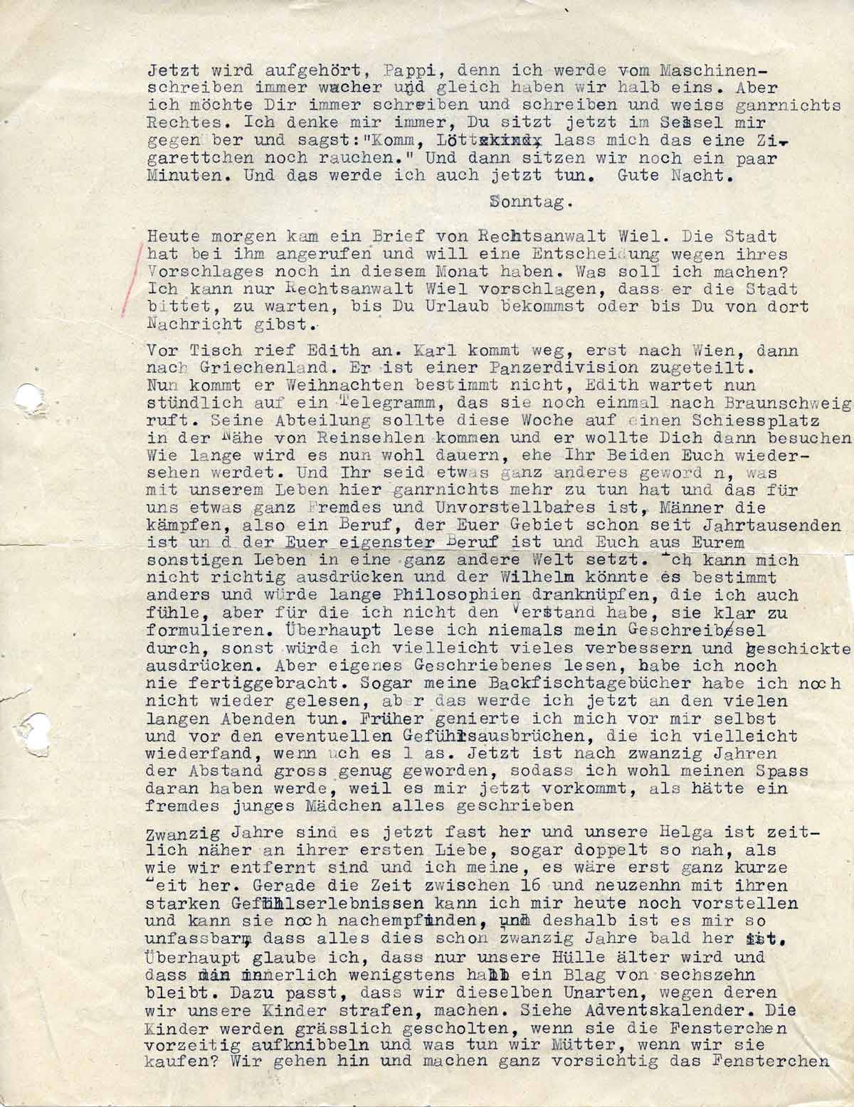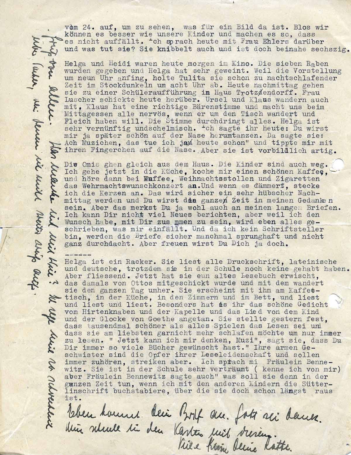 Die Omis gehen gleich aus dem Haus. Die Kinder sind auch weg. Ich gehe jetzt in die Küche, koche mir einen schönen Kaffee und höre dann bei Kaffee, Weihnachtsstollen und Zigaretten das Wehrmachtswunschkonzert. Und wenn es dämmert, stecke ich die Kerzen an. Das wird sicher ein sehr hübscher Nachmittag, und Du wirst die ganze Zeit in meinen Gedanken sein. Aber das merkst Du ja wohl auch an meinen langen Briefen. Ich kann Dir nicht viel Neues berichten, aber weil ich den Wunsch habe, mit Dir zusammen zu sein, wird eben alles geschrieben, was mir einfällt, und da ich kein Schreibtalent habe, werden die Briefe sicher manchmal sprunghaft und nicht ganz durchdacht. Aber freuen wirst Du dich doch.