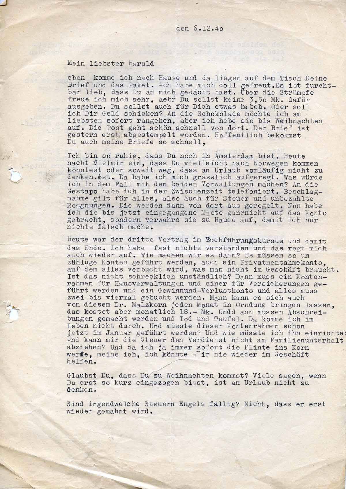Ich bin so ruhig, dass Du noch in Amsterdam bist. Heute nacht fiel mir ein, dass Du vielleicht nach Norwegen kommen könntest oder so weit weg, dass an Urlaub vorläufig nicht zu denken ist. Da habe ich mich grässlich aufgeregt. Was würde ich in dem Fall mit den beiden Verwaltungen machen? An die Gestapo habe ich in der Zwischenzeit telefoniert. Beschlagnahme gilt für alles, also auch für Steuer und unbezahlte Rechnungen. Die werden dann von dort aus geregelt. Nun habe ich die bis jetzt eingegangene Miete garnicht auf das Konto gebracht, sondern verwahre sie zu Hause auf, damit ich nur nichts falsch mache.