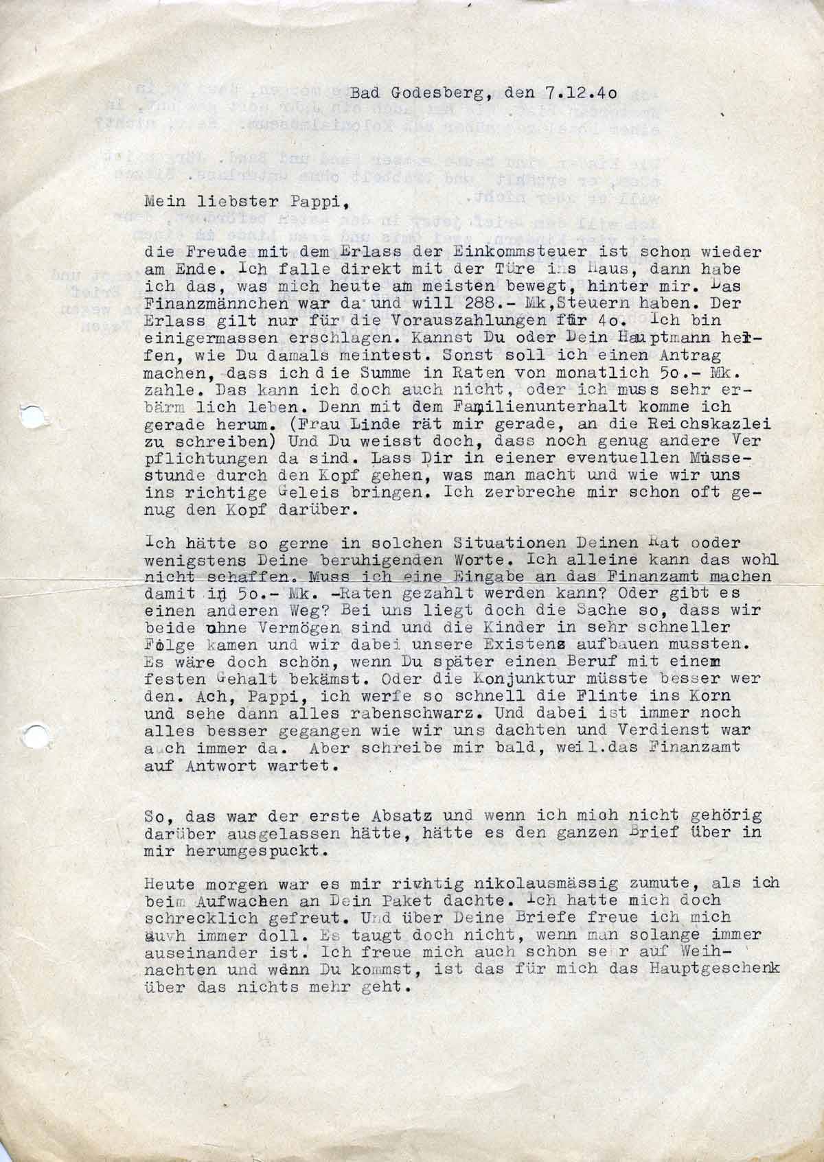 die Freude mit dem Erlass der Einkommensteuer ist schon wieder am Ende. Ich falle direkt mit der Türe ins Haus, dann habe ich das, was mich heute am meisten bewegt, hinter mir. Das Finanzmännchen war da und will 288.- Mk. Steuern haben. Der Erlass gilt nur für die Vorauszahlungen für 40. Ich bin einigermassen erschlagen. Kannst Du oder Dein Hauptmann helfen, wie Du damals meintest. Sonst soll ich einen Antrag machen, dass ich die Summe in Raten von monatlich 50.- Mk. Zahle. Das kann ich doch auch nicht, oder ich muss sehr erbärmlich leben. Denn mit dem Familienunterhalt komme ich gerade herum. (Frau Linde rät mir gerade, an die Reichskanzlei zu schreiben) Und Du weisst doch, dass noch genug andere Verpflichtungen da sind. Lass Dir in einer eventuellen Mussestunde durch den Kopf gehen, was man macht und wie wir uns ins richtige Geleis bringen. Ich zerbreche mir schon oft genug den Kopf darüber.