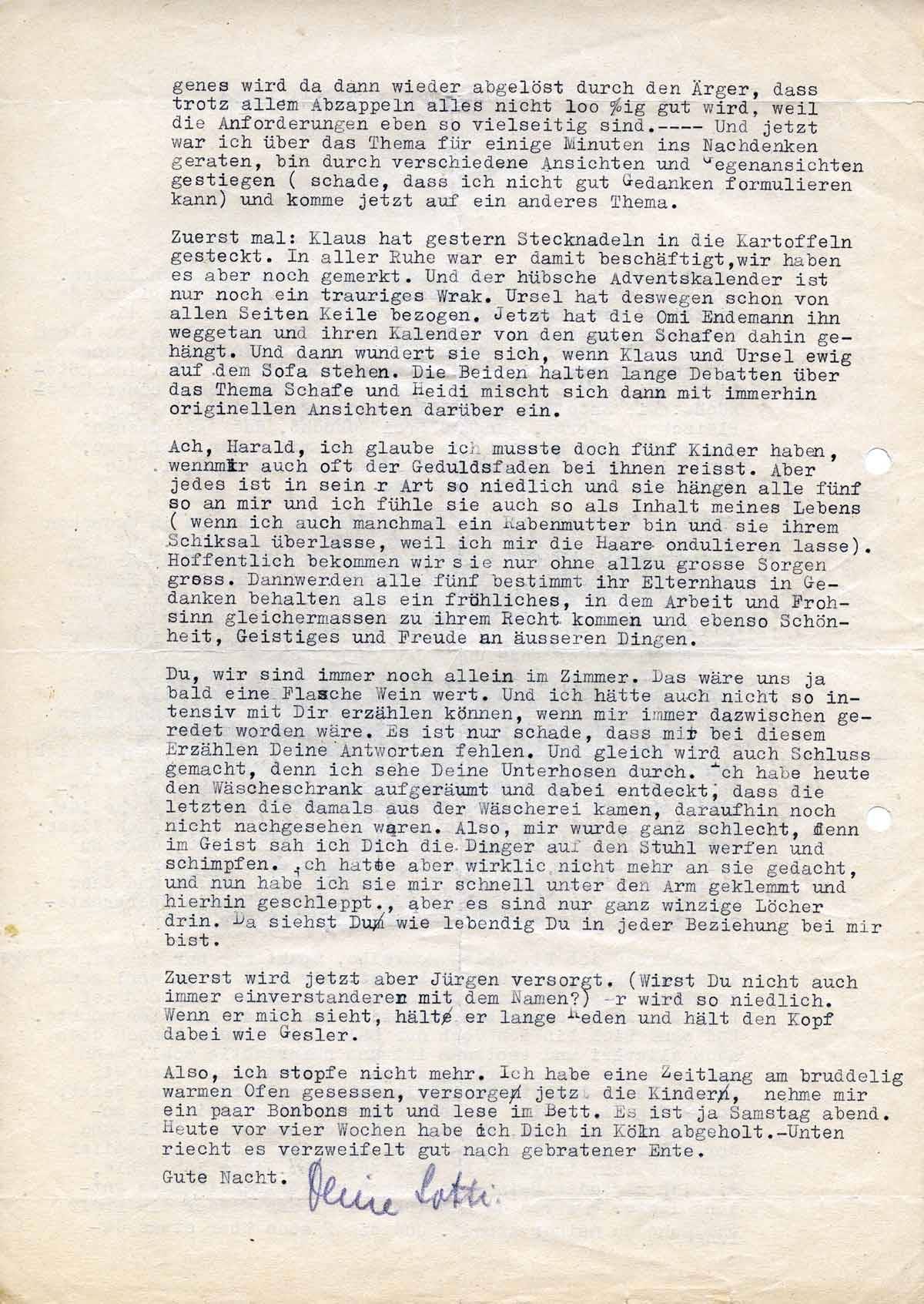 Und nun sitze ich hier oben auf der Couch und Du in Gedanken bei mir. Alle anderen sind noch unten beschäftigt. Auf dem Schreibtisch steht das Gewächs, das mir damals Hjalmar von Schwartze schenkte, mit drei Blüten. Wie der kleine Tisch vor der Couch augenblicklich aussieht, will ich Dir lieber nicht schildern. Die Schreibmaschine hat gerade noch Platz. Aber daneben liegen Deine zwei letzten Briefe, und ich sehe immer mal wieder rein und lese auch tüchtig zwischen den Zeilen und freue mich tief, dass Du mich so richtig lieb hast. Durch die Trennung hat man Zeit, sich das Bild des anderen wieder in seiner Wesenserscheinung zu gegenwärtigen, die man an ihm liebte. Und das war vielleicht in der letzten Zeit etwas vergessen worden.