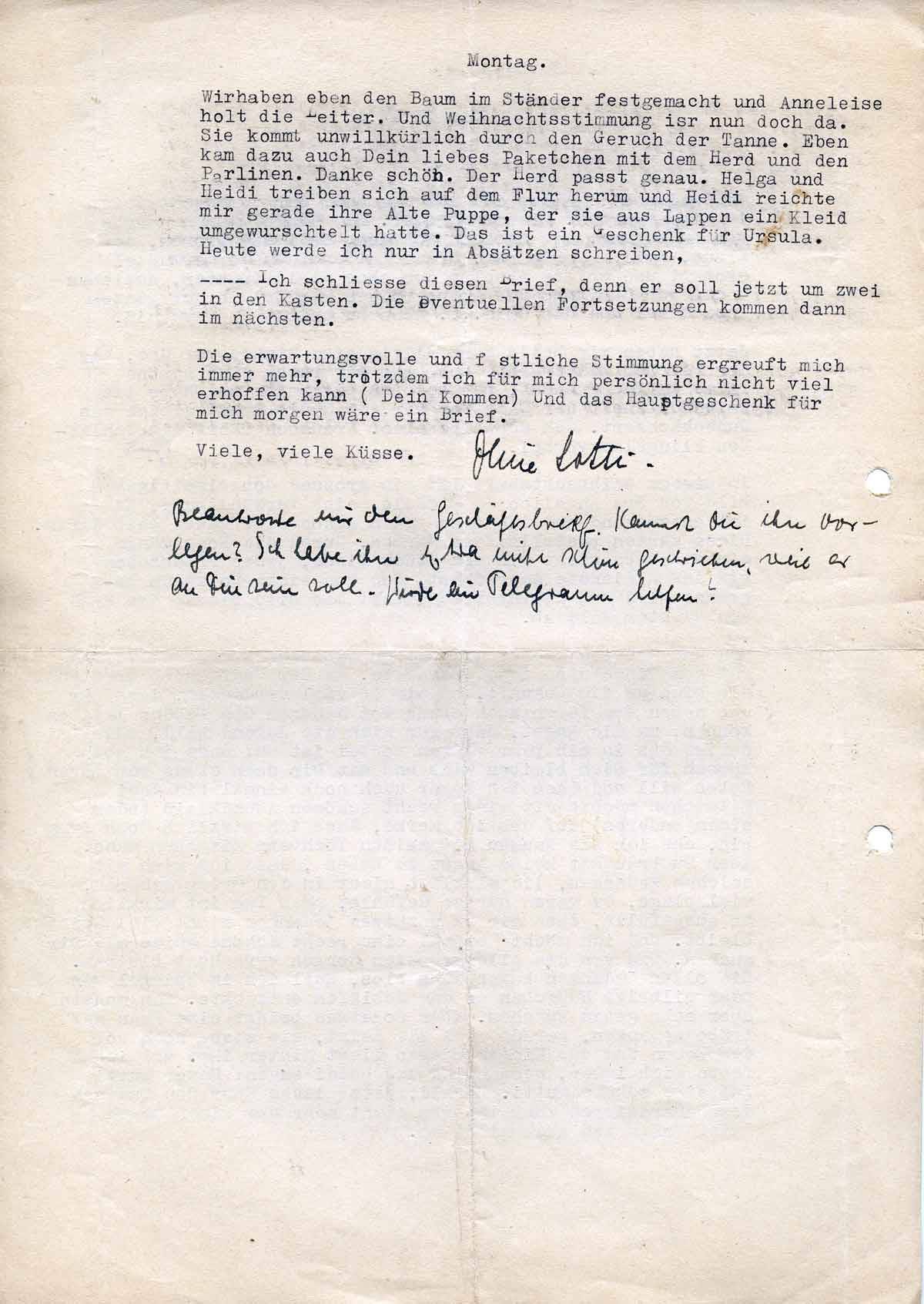 Die erwartungsvolle und festliche Stimmung ergreift mich immer mehr, trotzdem ich für mich persönlich nicht viel erhoffen kann (Dein Kommen) Und das hauptgeschenk für mich morgen wäre ein Brief.