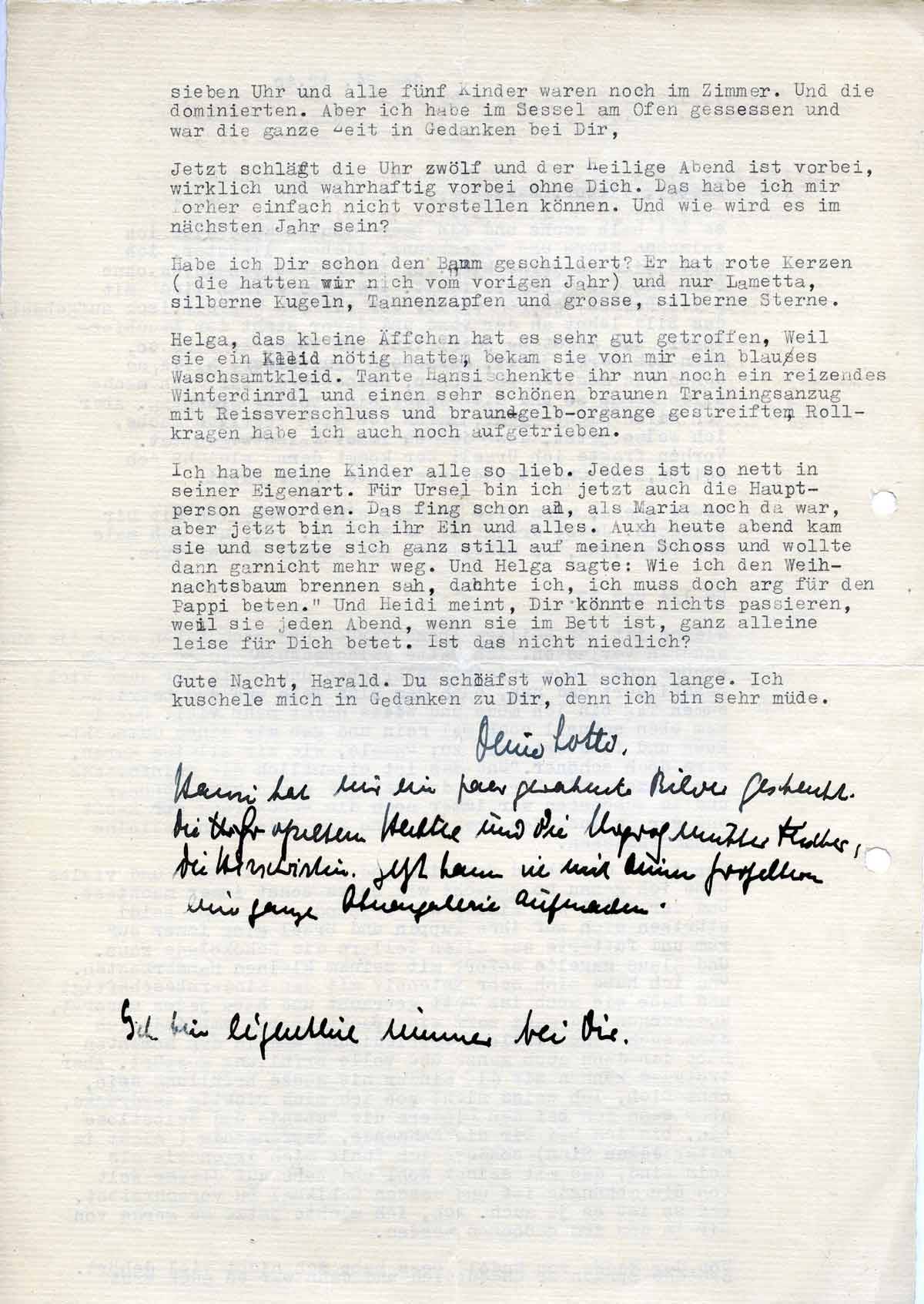 Sonst war der Abend festlich und schön wie immer, und vieles habe ich genauso gemacht, wie Du es sonst immer machtest. Der Jubel der Kinder war reizend. Helga und Heidi stürzten sich auf ihre Puppen, und Ursel ging immer nur rum und futterte aus allen Tellern die Schokolade raus .Und Klaus nagelte sofort mit seinem kleinen Hammerkasten. Und ich habe mich sehr intensiv mit den Kindern beschäftigt und habe jedes umsorgt, ausgezogen und ganz warm eingepackt. Dabei empfinde ich dann auch eine restlose Befriedigung, und in den Momenten habe ich dann auch ganze und volle Erfüllung gespürt. Aber trotzdem können mir die Kinder nie ganze Erfüllung sein ohne Dich. Ich weiß nicht, ob ich mich richtig ausdrücke, aber wenn ich bei den Kindern die Gebende und Selbstlose bin, bin ich bei Dir die Nehmende, Empfangende (nicht im materiellen Sinn), ich fühle mich irgendwie als Kind, das mit seinem Wohl und Wehe von Dir abhängig ist und dessen Schicksal Du vorschreibst. Und so ist es ja auch. Ach, ich möchte jetzt so gerne von Dir in den Arm genommen werden.