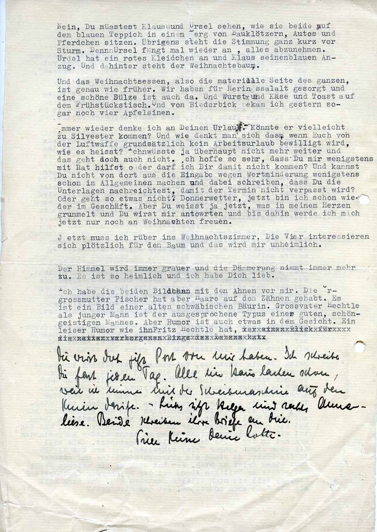 Immer wieder denke ich an Deinen Urlaub. Könnte er vielleicht zu Sylvester kommen? Und wie denkt man sich das, wenn Euch von der Luftwaffe grundsätzlich kein Arbeitsurlaub be-willigt wird, wie es heißt? Ich wüsste ja überhaupt nicht mehr weiter, und das geht doch auch nicht.