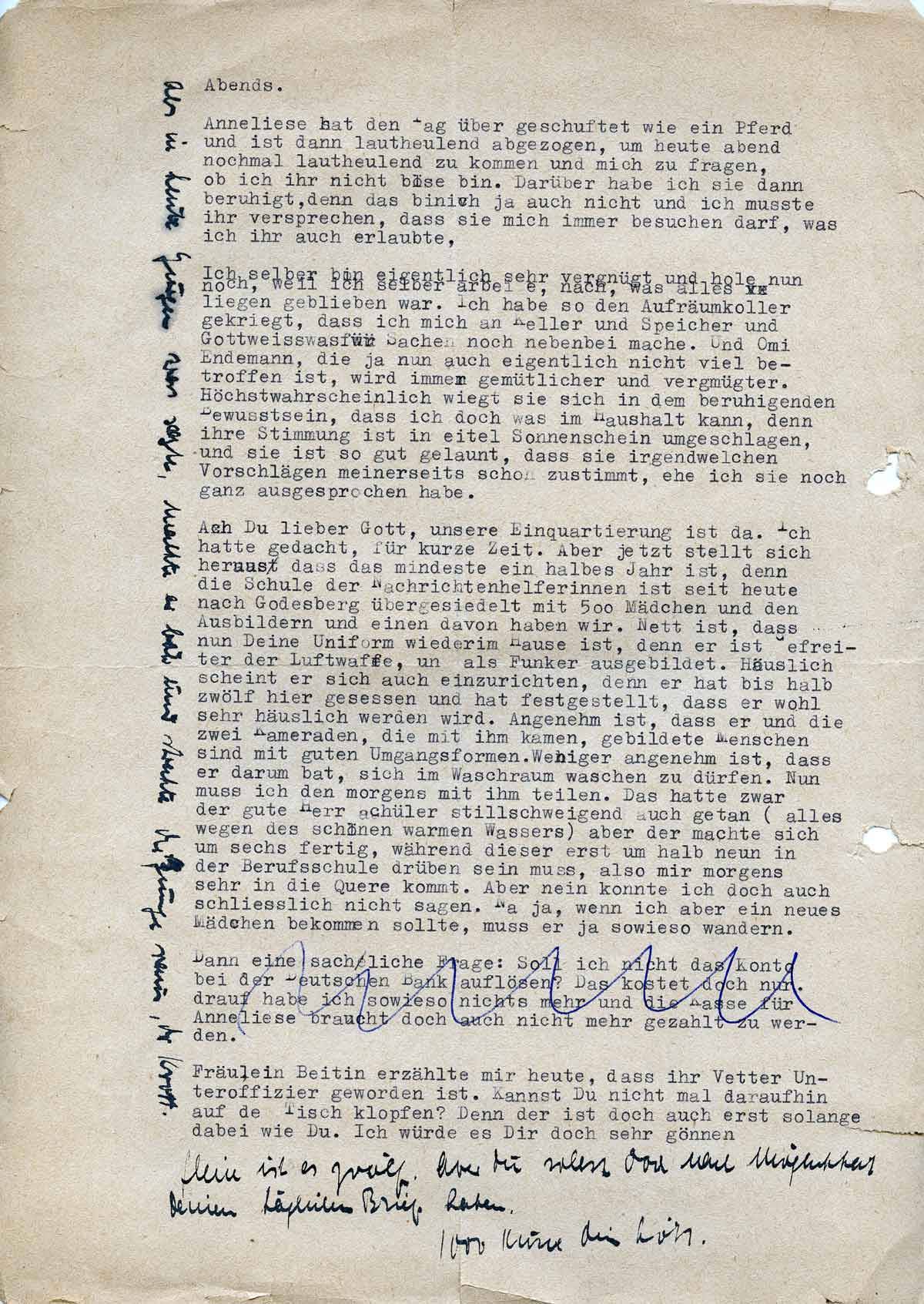 ----Ach du lieber Gott, unsere Einquartierung ist da. Ich hatte gedacht für kurze Zeit, aber nun zeigt es sich, dass das mindestens für ein halbes Jahr ist, denn die Schule der Nachrichtenhelferinnen ist seit heute nach Godesberg übergesiedelt mit 500 Mädchen und den Ausbildern, und einen davon haben wir.