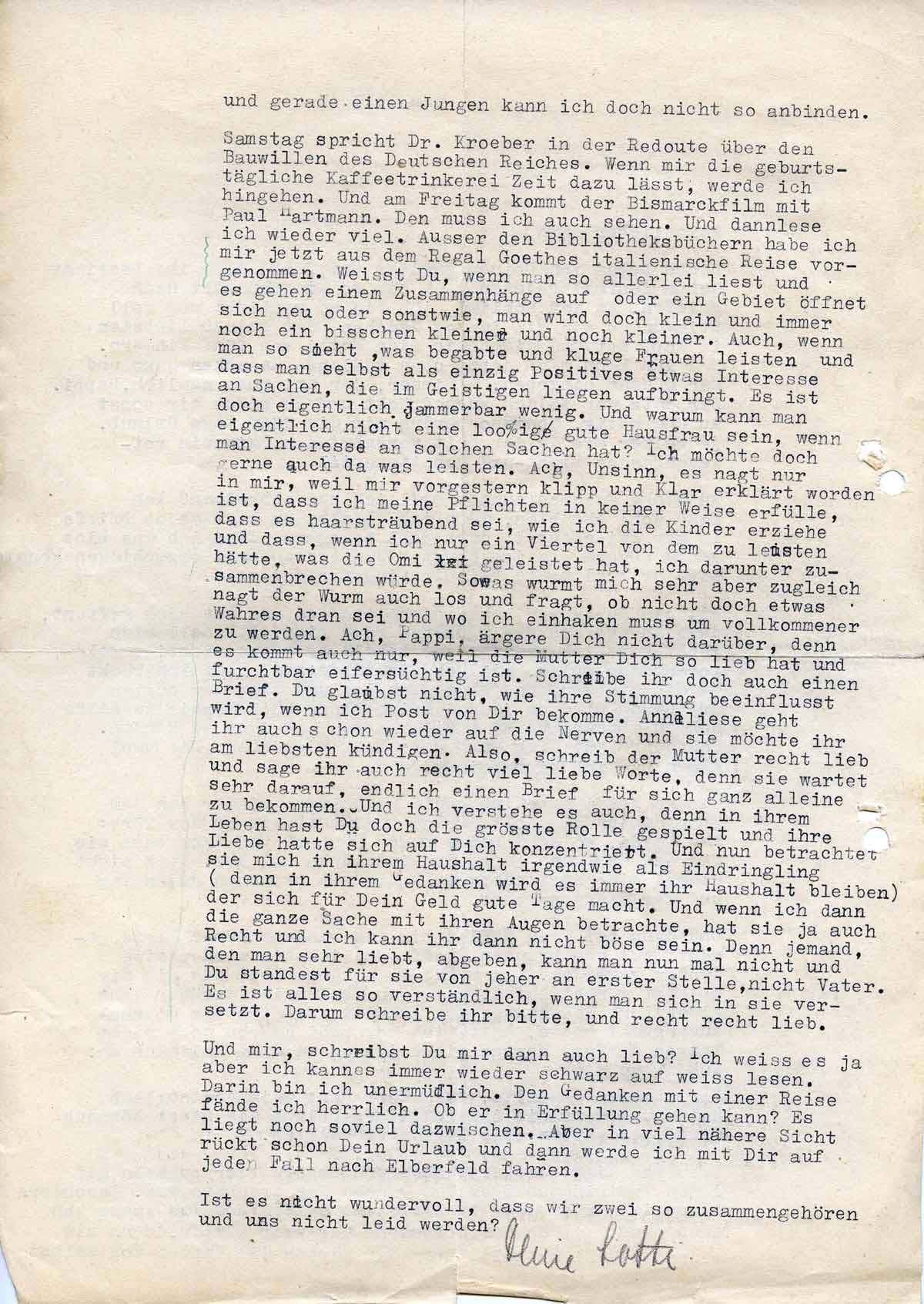 Also, schreib der Mutter recht lieb und sage ihr auch recht viel liebe Worte, denn sie wartet sehr darauf, endlich einen Brief ganz für sich allein zu bekommen. Und ich verstehe es auch, denn in ihrem Leben hast Du doch die größte Rolle gespielt, und all ihre Liebe hat sich auf Dich konzentriert. Und nun betrachtet sie mich in ihrem Haushalt irgendwie als Eindringling, (denn in ihren Gedanken wird es immer ihr Haushalt bleiben) der sich für Dein Geld gute Tage macht. Und wenn ich dann die ganze Sache mit ihren Augen betrachte, hat sie ja auch recht, und ich kann ihr nicht böse sein. Denn jemand, den man sehr liebt, abgeben, kann man nun mal nicht. Und Du standest für sie von jeher an erster Stelle, nicht Vater. Es ist alles so verständlich, wenn man sich in sie versetzt. Darum schreibe ihr bitte, und recht, recht lieb.