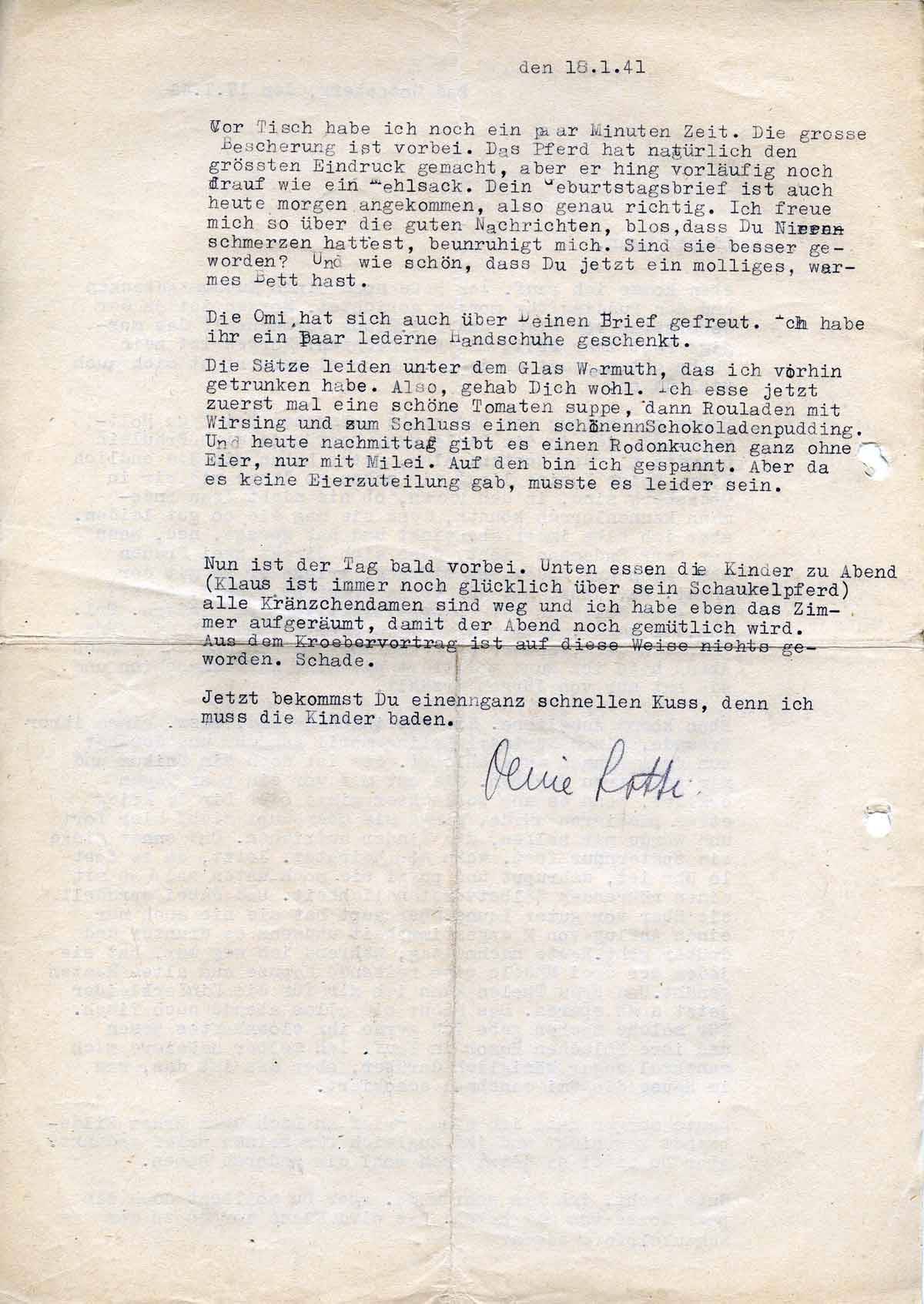 Die Omi hat sich auch über Deinen Brief gefreut. Ich habe ihr ein Paar lederne Handschuhe geschenkt. Also, gehab Dich wohl. Ich esse jetzt zuerst mal eine schöne Tomatensuppe, dann Rouladen mit Wirsing und zum Schluss einen schönen Schokoladenpudding. Und heute nachmittag gibt es einen Rodonkuchen, ganz ohne Eier, nur mit Milei. Auf den bin ich gespannt. Aber da es keine Eierzuteilung gibt, musste es leider sein.