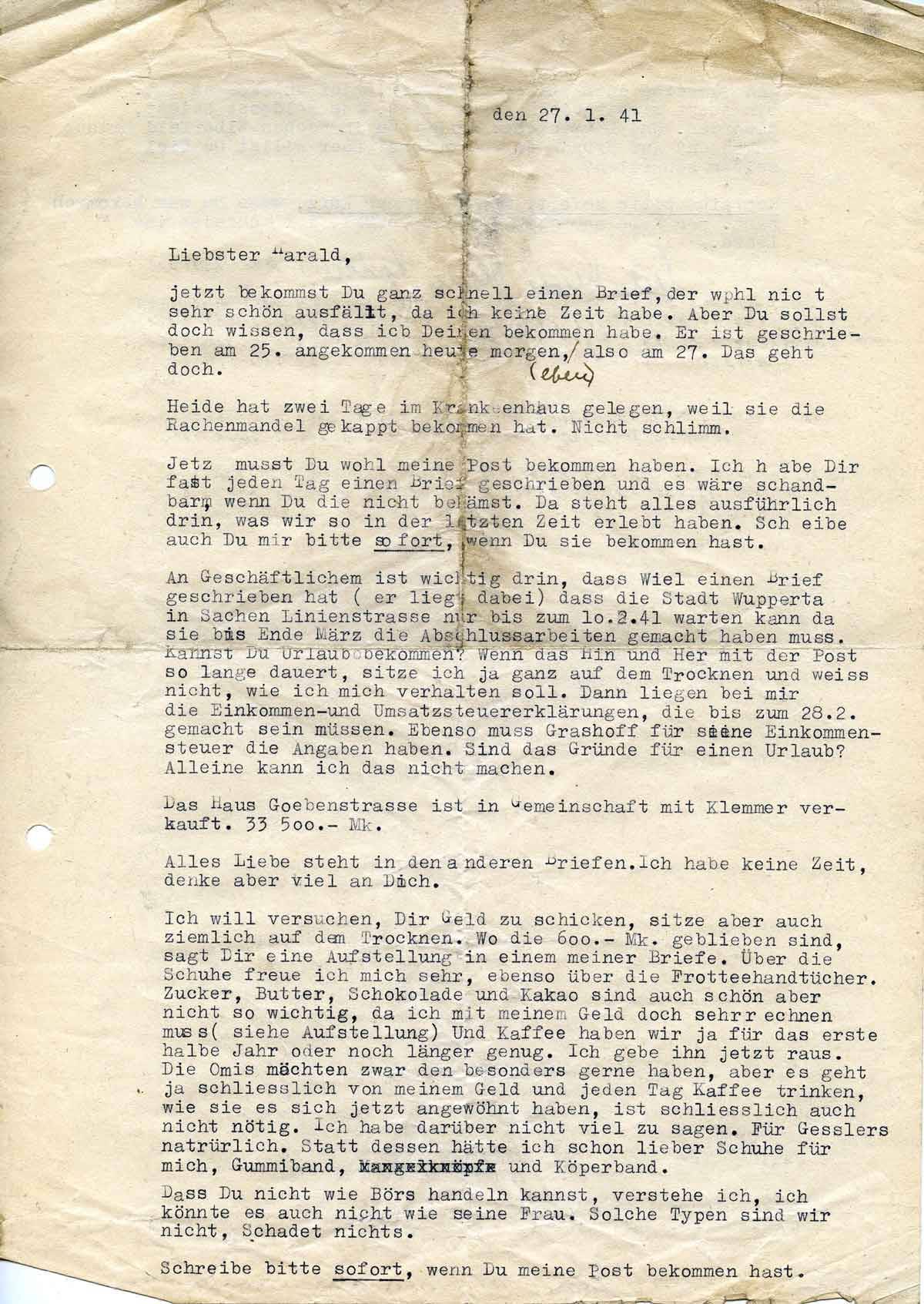 An Geschäftlichem ist wichtig drin, dass Weil einen Brief geschrieben hat (er liegt dabei) dass die Stadt Wuppertal in Sachen Linienstrasse nur bis zum 10. 2. 41 warten kann da sie bis Ende März die Abschlussarbeiten gemacht haben muss. Kannst Du Urlaub bekommen? Wenn das Hin und Her mit der Post so lange dauert, sitze ich ja ganz auf dem Trocknen und weiss nicht, wie ich mich verhalten soll. Dann liegen bei mir die Einkommen- und Umsatzsteuererklärungen, die bis zum 28.2. gemacht sein müssen. Ebenso muss Grashoff für seine Einkommensteuer die Angaben haben. Sind das Gründe für einen Urlaub? Alleine kann ich das nicht machen.
