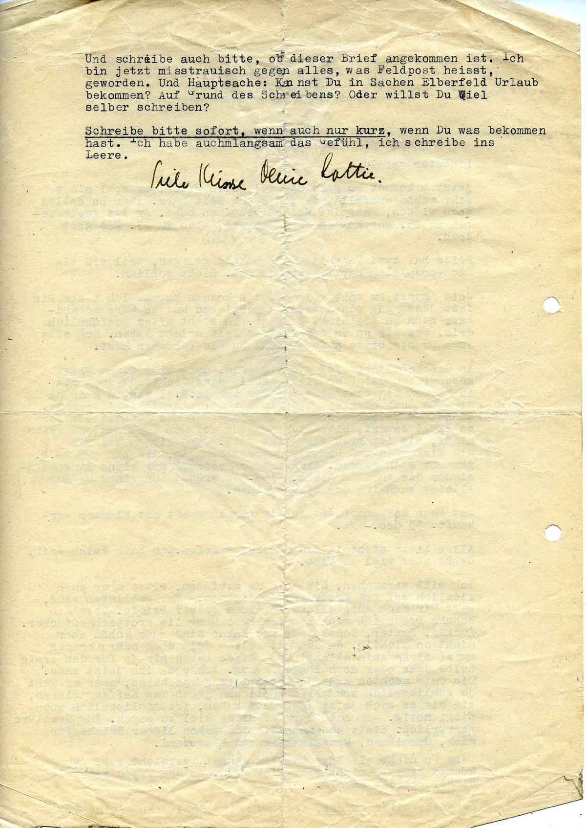 Und schreibe auch bitte, ob dieser Brief angekommen ist. Ich bin jetzt misstrauisch gegen alles, was Feldpost heisst, geworden. Und Hauptsache: Kannst du in Sachen Elberfeld Urlaub bekommen? Auf Grund des Schreibens? Oder willst Du Wiel selber schreiben?