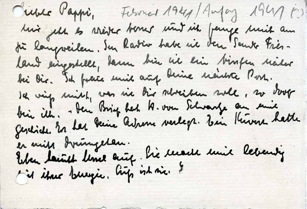 Ich weiß nicht, was ich Dir schreiben soll, so doof bin ich. Den Brief hat A. von Schwartze an mich geschickt. Er hat Deine Adresse verlegt. Ein Kuvert hatte er nicht drumgetan.