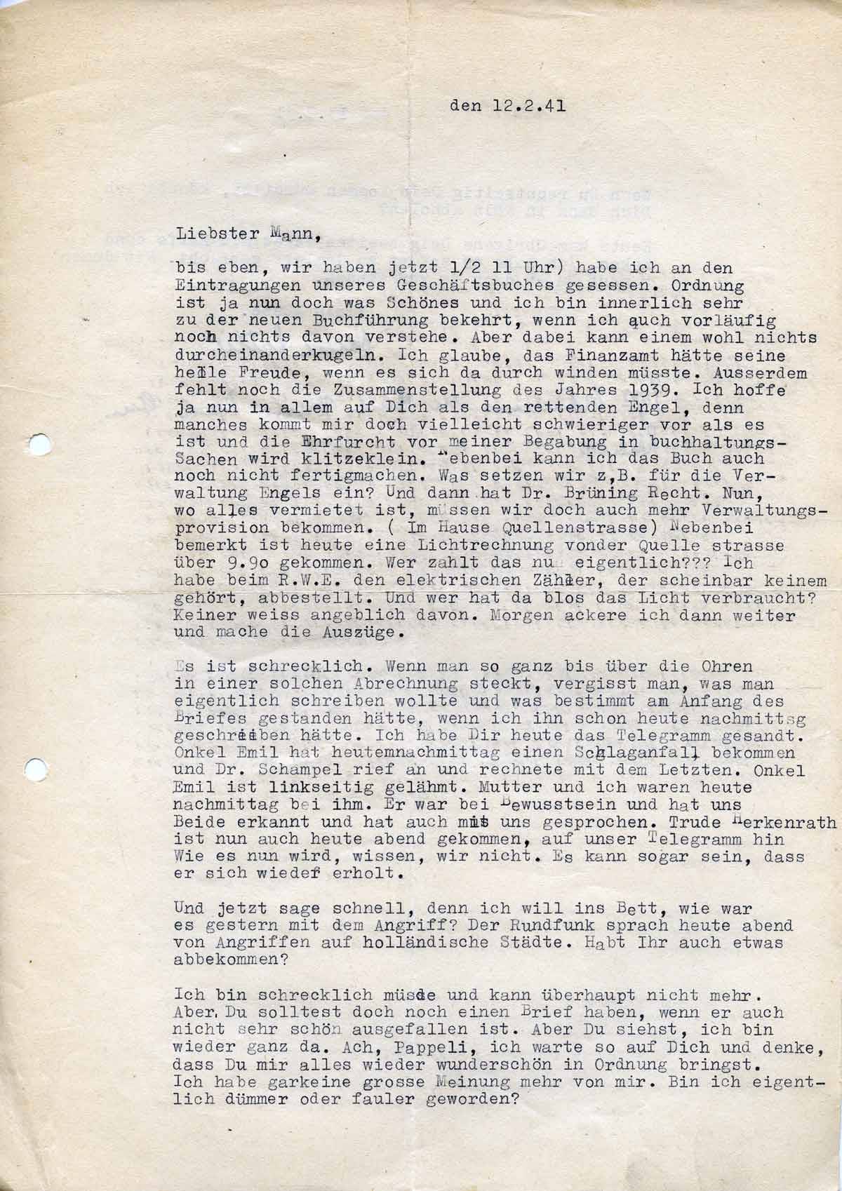 bis eben, wir haben jetzt ½ 11 Uhr) habe ich an den Eintragungen unseres Geschäftsbuches gesessen. Ordnung ist ja nun doch was Schönes und ich bin innerlich sehr zu der neuen Buchführung bekehrt, wenn ich auch vorläufg noch nichts davon verstehe. Aber dabei kann einem wohl nichts durcheinanderkugeln. Ich glaube, das Finanzamt hätte seine helle Freude, wenn es sich da durch winden müsste. Ausserdem fehlt noch die zusammenstellung des Jahres 1939. Ich hoffe ja nun in allem auf Dich als den rettenden Engel, denn manches kommt mir doch vielleicht schwieriger vor als es ist und die Ehrfurcht vor meiner Begabung in buchaltungs—Sachen wird klitzeklein. Nebenbei kann ich das Buch auch noch nicht fertigmachen. Was setzen wir z.B. für die Verwaltung Engels ein? Und dann hat Dr. Brüning Recht. Nun, wo alles vermietet ist, müssen wir doch auch mehr Verwaltungsprovision bekommen. (Im Hause Quellenstrasse) Nebenbei bemerkt ist heute eine Lichtrechnung von der Quellenstrasse über 9.90 gekommen. Wer zahlt da nun eigentlich??? Ich habe beim R.W.E. den elektrischen Zähler, der scheinbar keinem gehört, abbestellt. Und wer hat da blos das Licht verbraucht? Keiner weiss angeblich davon. Morgen ackere ich dann weiter und mache die Auszüge.