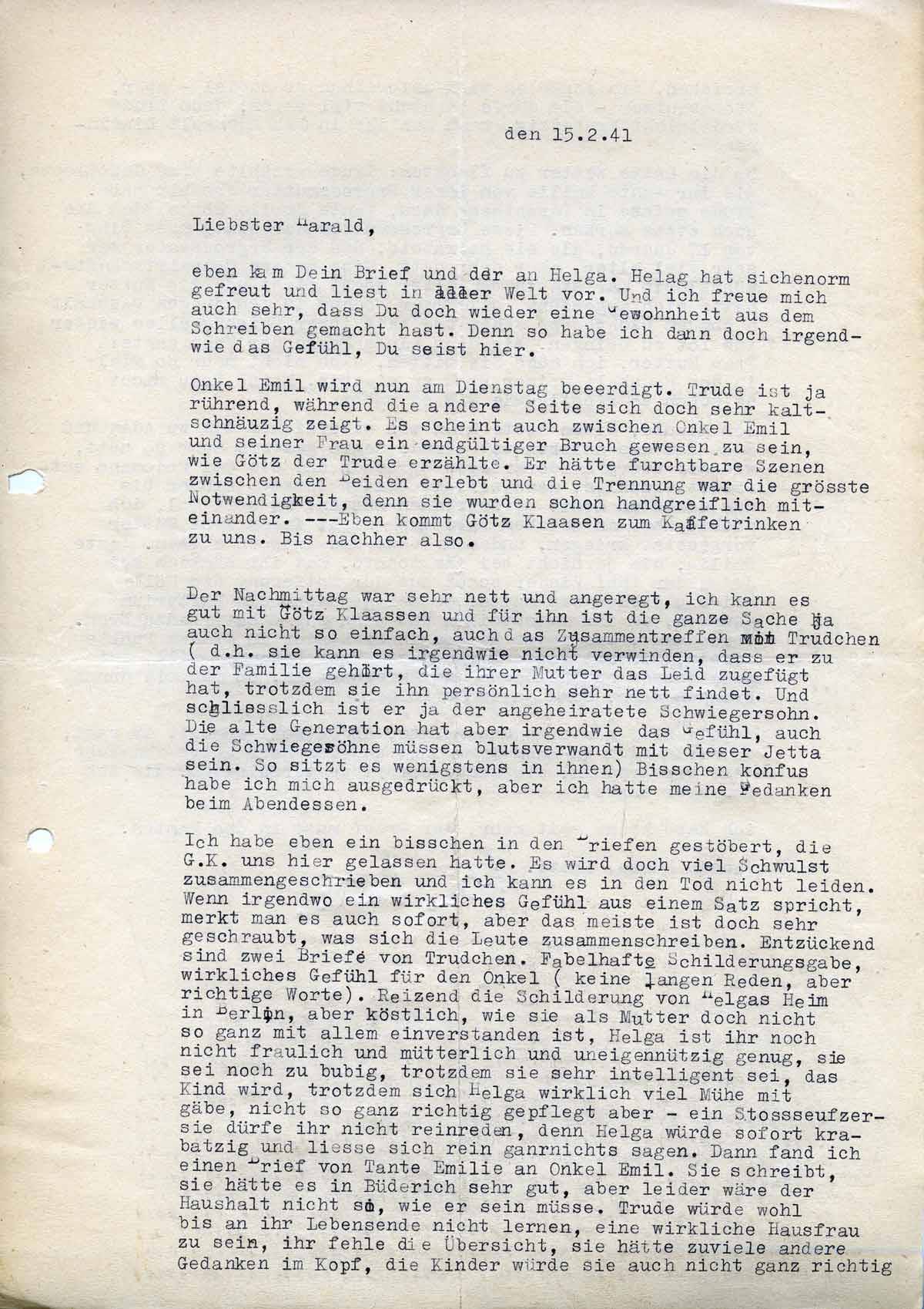 Charlotte Endemann an ihren Mann Harald, 15. Februar 1941