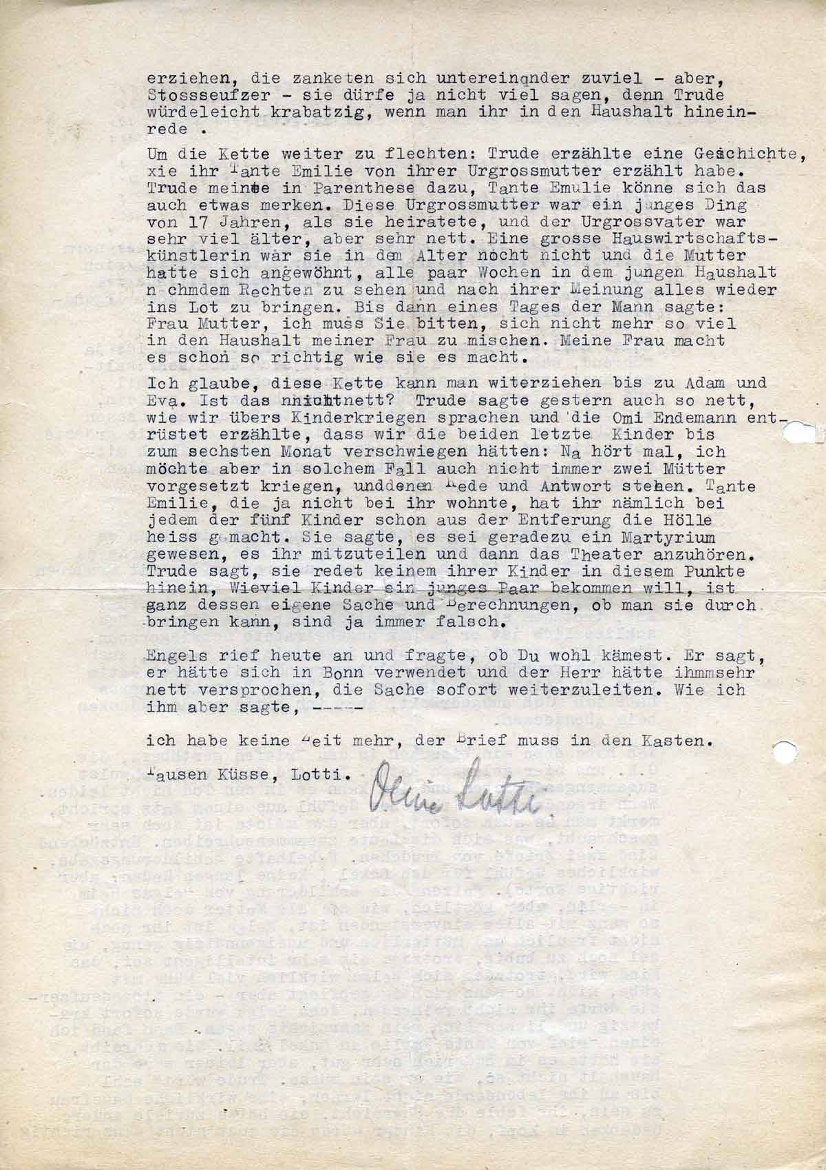 Ich glaube, diese Kette mann man weiterziehen bis zu Adam und Eva. Ist das nicht nett? Trude sagte gestern auch so nett, wie wir übers Kinderkriegen sprachen und die Omi Endemann erzählte, dass wir die beiden letzten Kinder bis zum 6. Monat verschwiegen hätten: Na, hört mal, ich möchte in solchem Fall auch nicht immer zwei Mütter vorgesetzt kriegen und denen Rede und Antwort stehen.