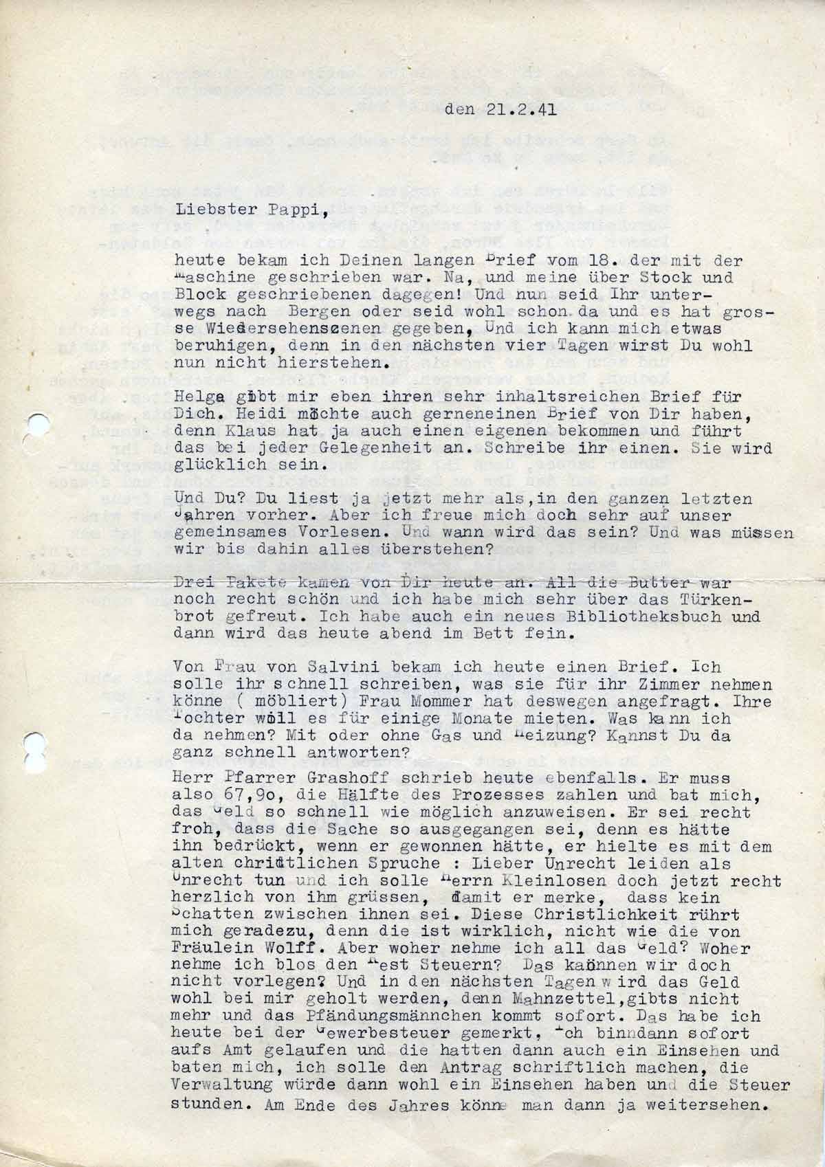 Charlotte Endemann an ihren Mann Harald, 21. Februar 1941