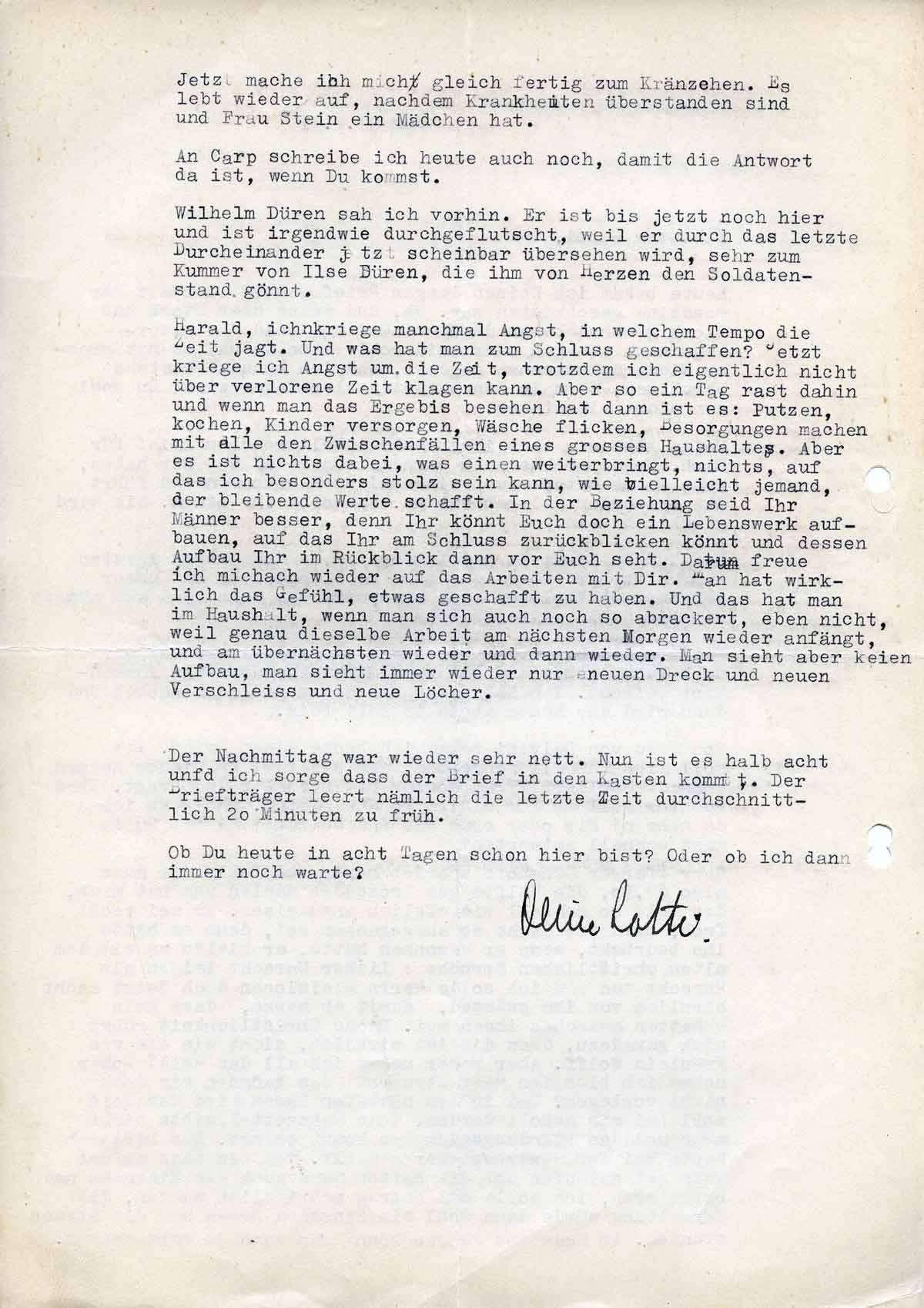 Harald, ich kriege manchmal Angst, in welchem Tempo die Zeit jagt. Und was hat man zum Schluss geschaffen? Jetzt kriege ich Angst um die Zeit, trotzdem ich eigentlich nicht über verlorene Zeit klagen kann. Aber so ein Tag rast dahin, und wenn man das Ergebnis besieht, dann ist es: Putzen, Kochen, Kinder versorgen, Wäsche flicken, Besorgungen machen mit all den Zwischenfällen eines großen Haushalts. Aber es ist nichts, was einen weiterbringt, nichts, auf das ich besonders stolz sein kann, wie vielleicht jemand, der bleibenden Wert schafft.